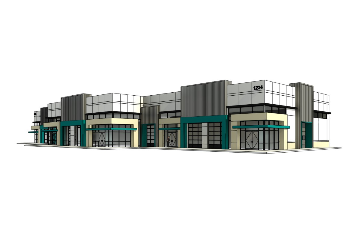 make night render with lights inside add exterior lighting and parking lot lighting make it look realistic add arizona desert landscape behind add palm trees add cars parked in front perpendicular to the building add a couple people in front make the gray elements look like galvanized metal make the green and tan elements look like acm metal panels