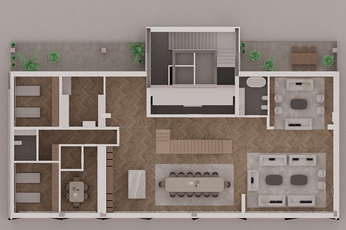 modernist exterior shot make a modern render for the apartment floor it should be a 3d render view architecture
