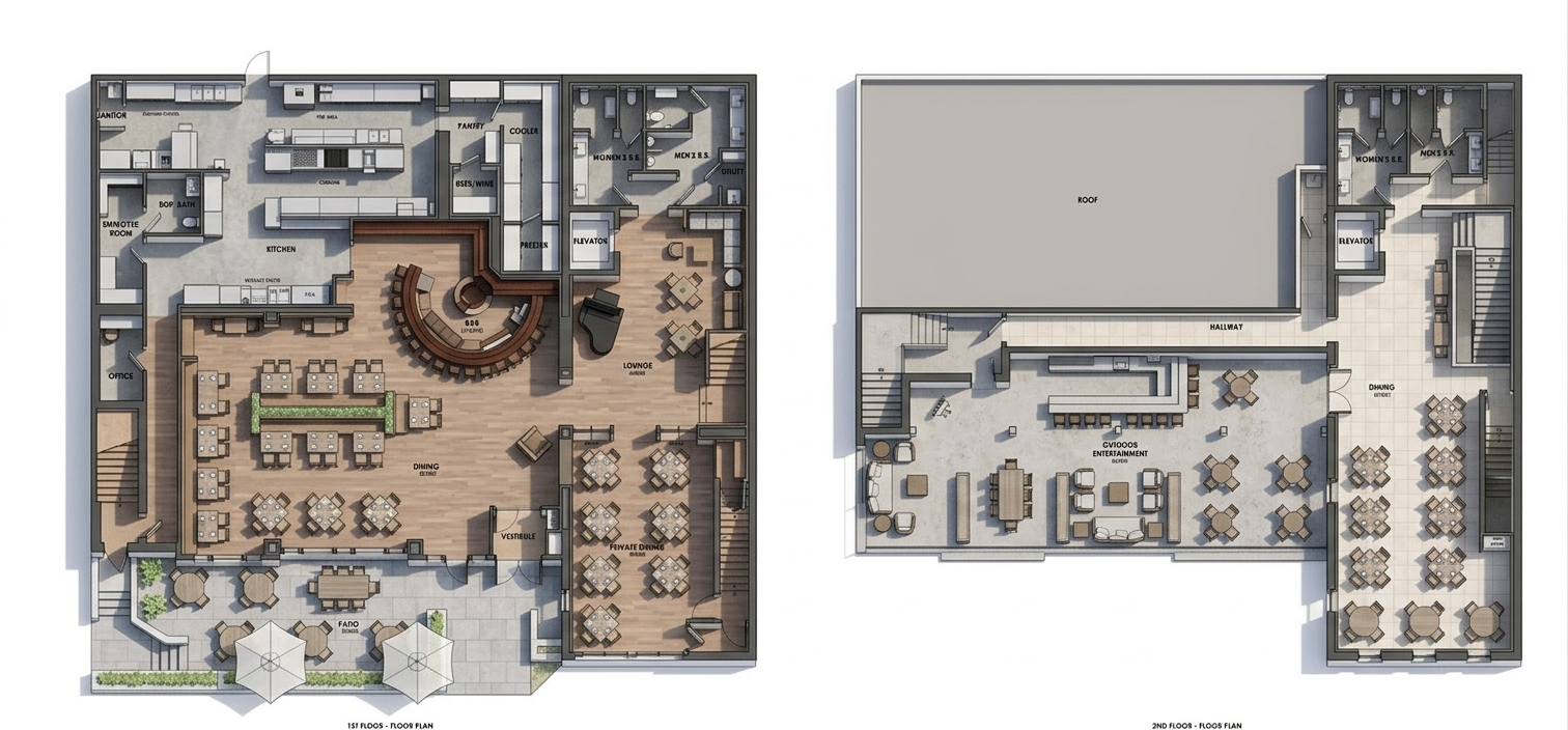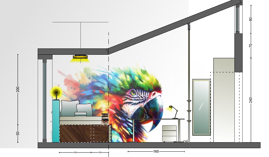 convert this floor plan into a realistic isometric 3d view of a full house show the space from an elevated angle with furniture walls and details visible archicad 3d aufbau schritt f r schritt 1 projekt vorbereiten neues projekt ffnen arbeitsumgebung grundriss ma einheit zentimeter ebenen standard reicht 2 grundriss exakt nachbauen 2d du hast bereits einen 2d grundriss aber hier die schritte falls du ihn neu anlegst 2 1 au enwand 340 cm wandwerkzeug gerade wand l nge 340 cm wandh he 250 cm das ist die au enwandh he 2 2 rechte wand 520 cm wandwerkzeug gerade wand l nge 520 cm wandh he 390 cm weil vorne 390 2 3 linke wand gebogen wandwerkzeug bogen startpunkt vorne links endpunkt hinten links wandh he 390 cm vorne sp ter wird sie hinten abgesenkt 2 4 hintere wand 340 cm wandwerkzeug gerade wand l nge 340 cm wandh he 250 cm damit ist der grundriss geschlossen 3 podest modellieren 2d 3d 3 1 podestfl che zeichnen slab bodenplatte werkzeug rechteck 340 cm 160 cm h he 50 cm oberkante 50 cm unterkante 0 cm 3 2 stufenblock slab werkzeug rechteck 50 cm 160 cm position start 210 cm von links ende 260 cm von links h he 50 cm 3 3 podest aufteilung nur linien linie bei 200 cm linie bei 210 cm linie bei 260 cm linie bei 270 cm damit ist die geometrie exakt 4 fenster einbauen fensterwerkzeug breite 40 cm h he 250 cm position rechtsb ndig in der au enwand unterkante 0 cm oberkante 250 cm 5 decke mit knick modellieren das ist der wichtigste teil und archicad kann das perfekt 5 1 erste deckenplatte hinten decke werkzeug fl che gesamte raumfl che h he 250 cm dicke egal z b 20 cm 5 2 deckenknick setzen 160 cm von der au enwand eine linie ziehen decke teilen rechtsklick trennen jetzt hast du zwei deckenteile 5 3 vordere decke anheben vordere decke ausw hlen oberkante 390 cm unterkante 390 cm dicke archicad verbindet die beiden deckenteile automatisch mit einer schr ge 6 wandh hen korrigieren f r die schr ge 6 1 rechte wand hinterer abschnitt 250 cm vorderer abschnitt 390 cm wand teilen h hen anpassen wandoberkante auf dach decke folgen setzen 6 2 linke wand gebogen wand teilen hinten 250 vorne 390 oberkante ebenfalls auf decke folgen archicad passt die schr ge automatisch an die gebogene wand an 7 3d modell erzeugen dr cke f3 oder klicke auf 3d fenster du siehst jetzt den raum in 3d ohne m bel mit korrekter schr ge mit korrektem podest mit korrekten stufen mit korrekten wandh hen mit gebogener linker wand mit fenster das ist dein sauberes korrektes 3d modell 8 perspektive aus der t r einstellen kamera 3d schnittkamera position vorne links t rposition blick leicht nach rechts field of view 60 h he der kamera 150 cm zielpunkt mitte des podests jetzt hast du genau die perspektive die wir gemeinsam definiert haben 9 seitenansicht rechts kamera rechts vorne platzieren blick nach links h he 150 cm zielpunkt mitte podest 10 seitenansicht links kamera links vorne platzieren blick nach rechts h he 150 cm zielpunkt mitte podest use the same furniture as shows on the plan do not change the orientation of the floorplan