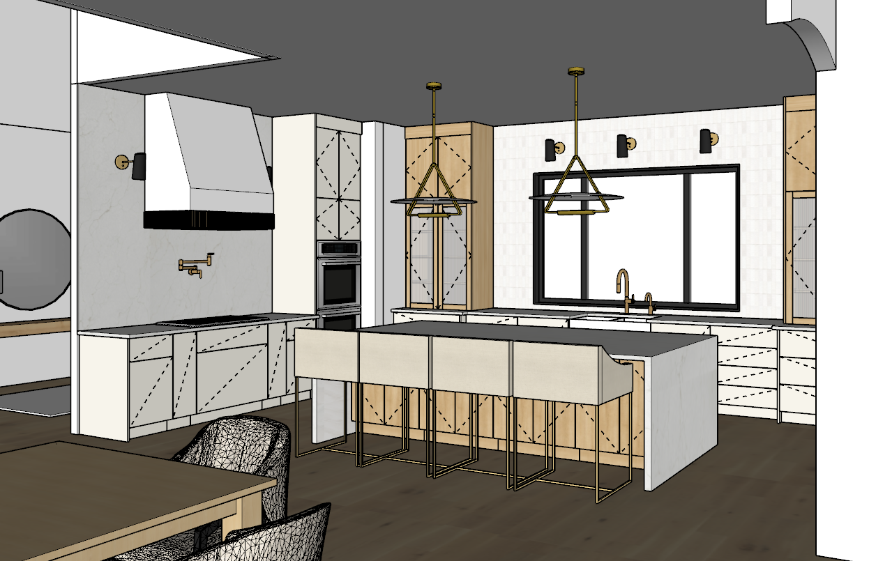 bright day time natural lighting soft shadows space is evenly lid downlights and pendant lights on white light 5000k lighting temperature interior photography realistic slightly reflective honed tiles