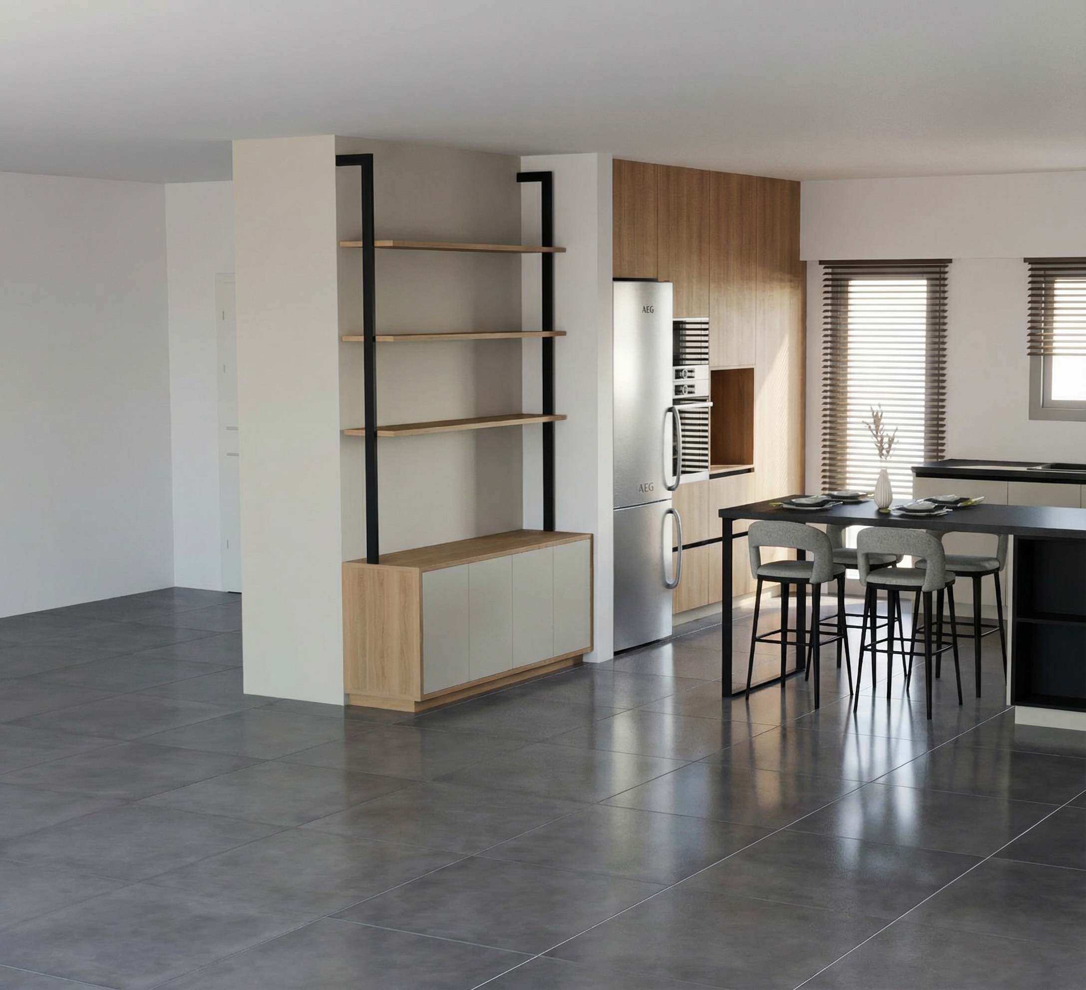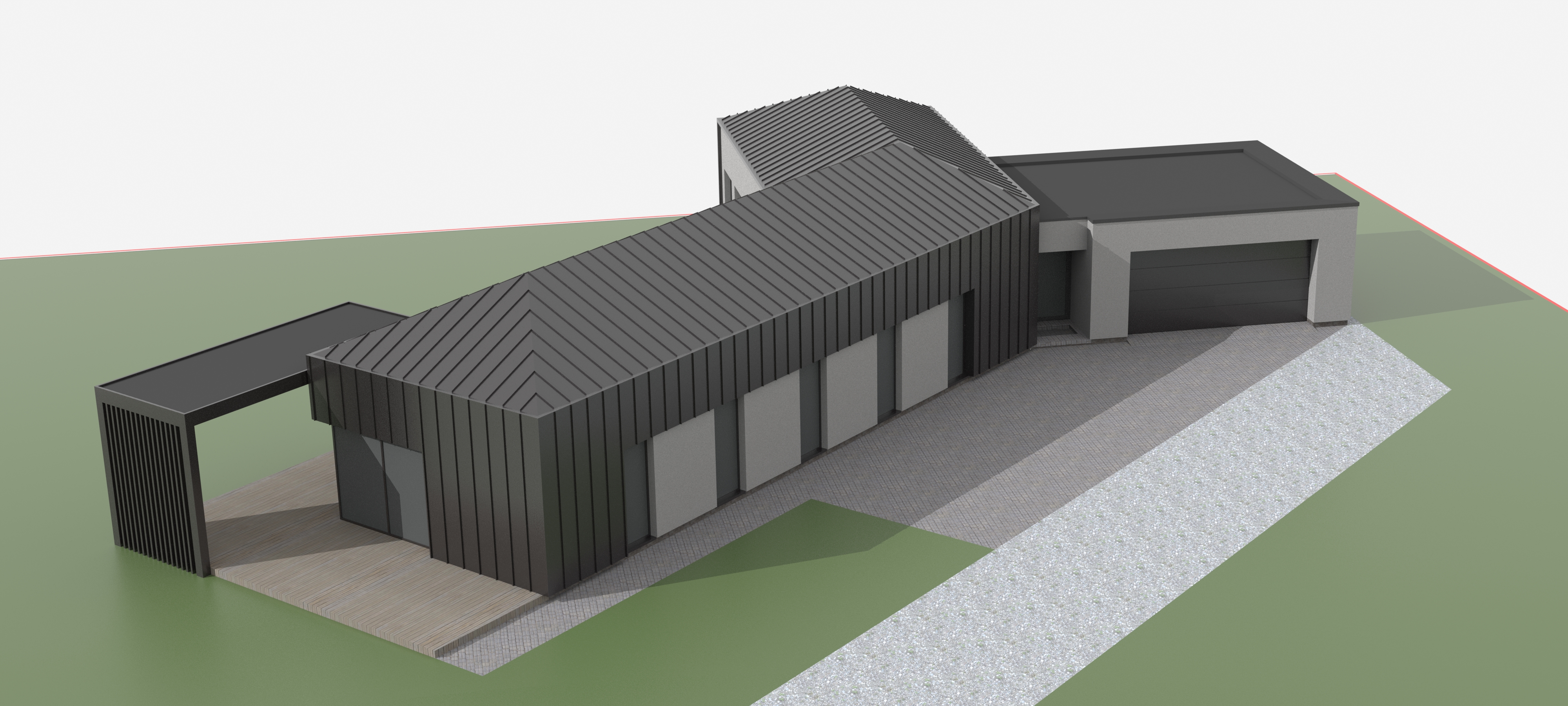 render a modern architectural building with a sleek linear design feature a structure with a charcoal gray metal roof and facade with segments of light grey plaster creating a minimalist aesthetic the roof and walls reflect a glossy black that contrasts with the surrounding light gray paved pathway which extends into a light gray gravel driveway the area around the building is covered in lush green grass set the scene in a clear bright atmosphere with soft sunlight casting gentle shadows enhancing the building s modern elegance change red line to dark grey metal wire fence make windows transparent