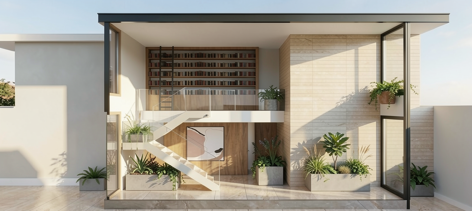 interior shot living room warm grey colours and a mid tone oak furniture add wall decor and a fully equiped kitchen
