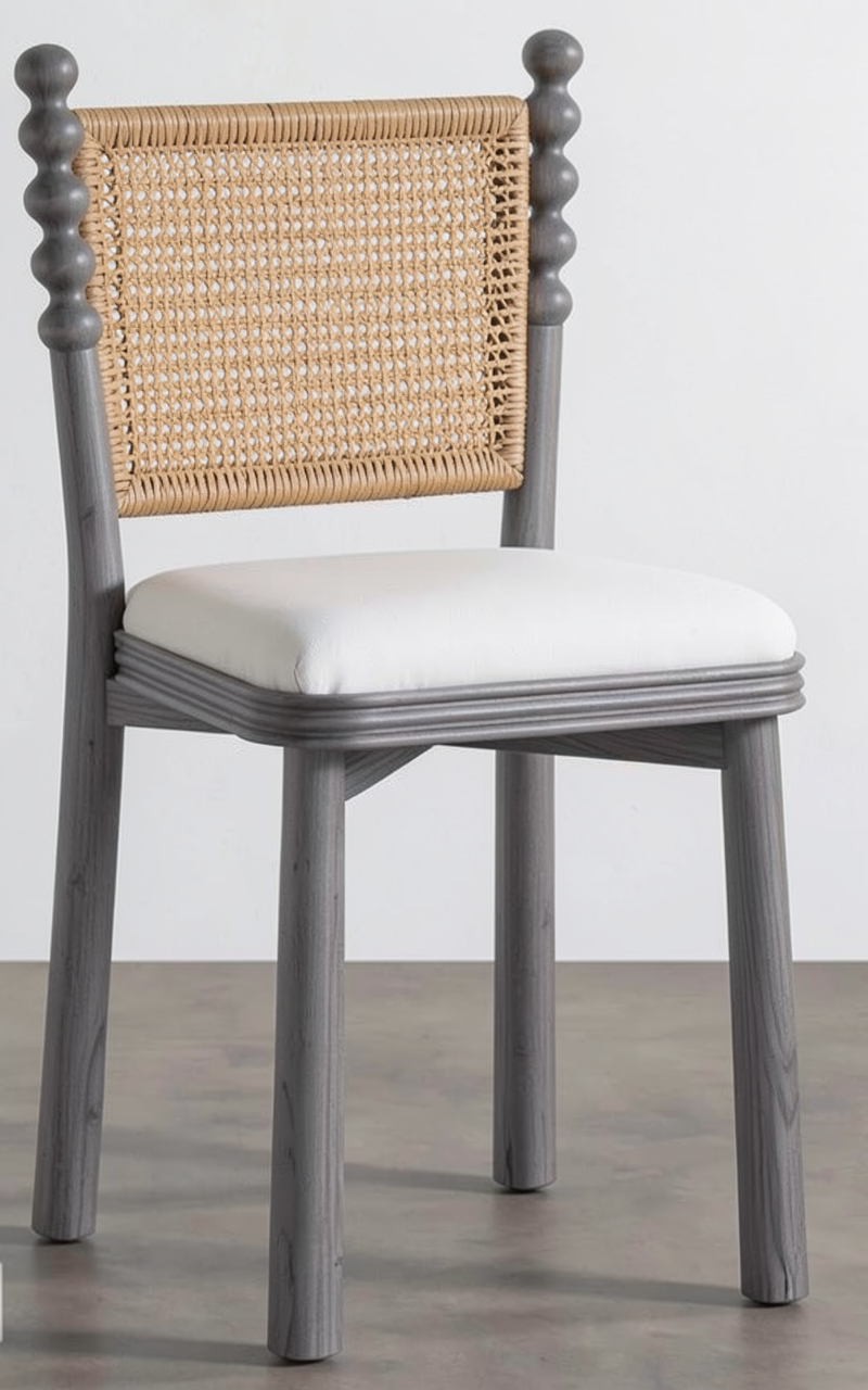 raffia weaving accent inspired back white upholstered seat and back chair teak wood finish
