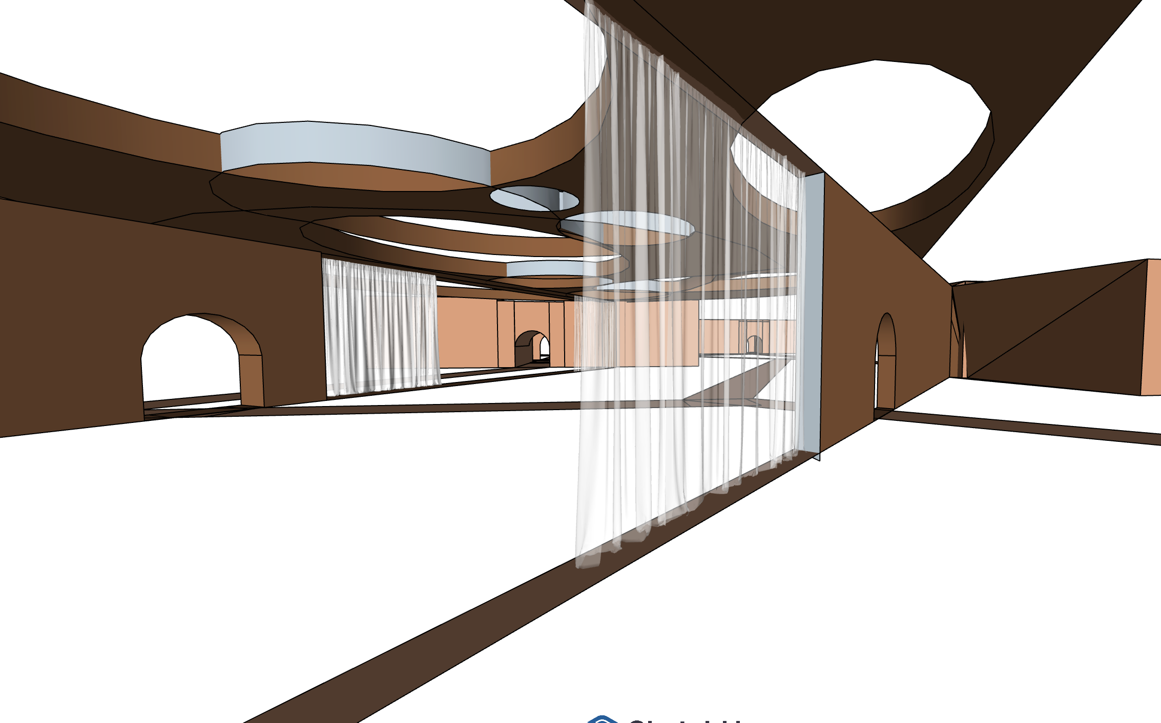 sustainable design exterior shot view of a roof from corten steel and wooden pathways on the ground gravel curtains and walls and cabins from mix wood and corten make it 1000 accurate to the sketch dont change nothing no backround architecture