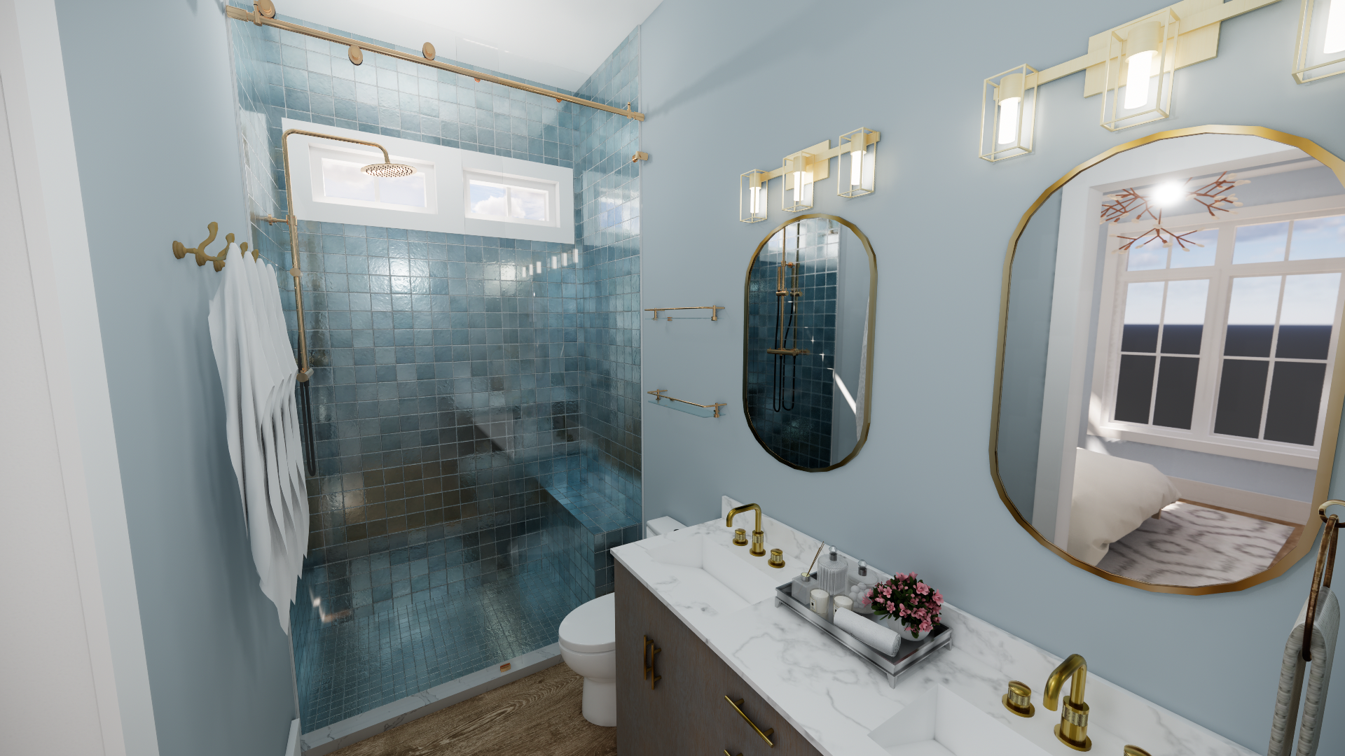 you are a professional image renderer you create the highest grade renderings around and specialize in architectural renderings this is an interior rendering of a bathroom in a luxury home create a high resolution photorealistic image of this room keep the windows as they are where they are keep the doors as they are where they are keep the main structure as it is where it is feel free to change the perspective keep the ceiling as it is where is it do not add anything to the structure that i have not asked for