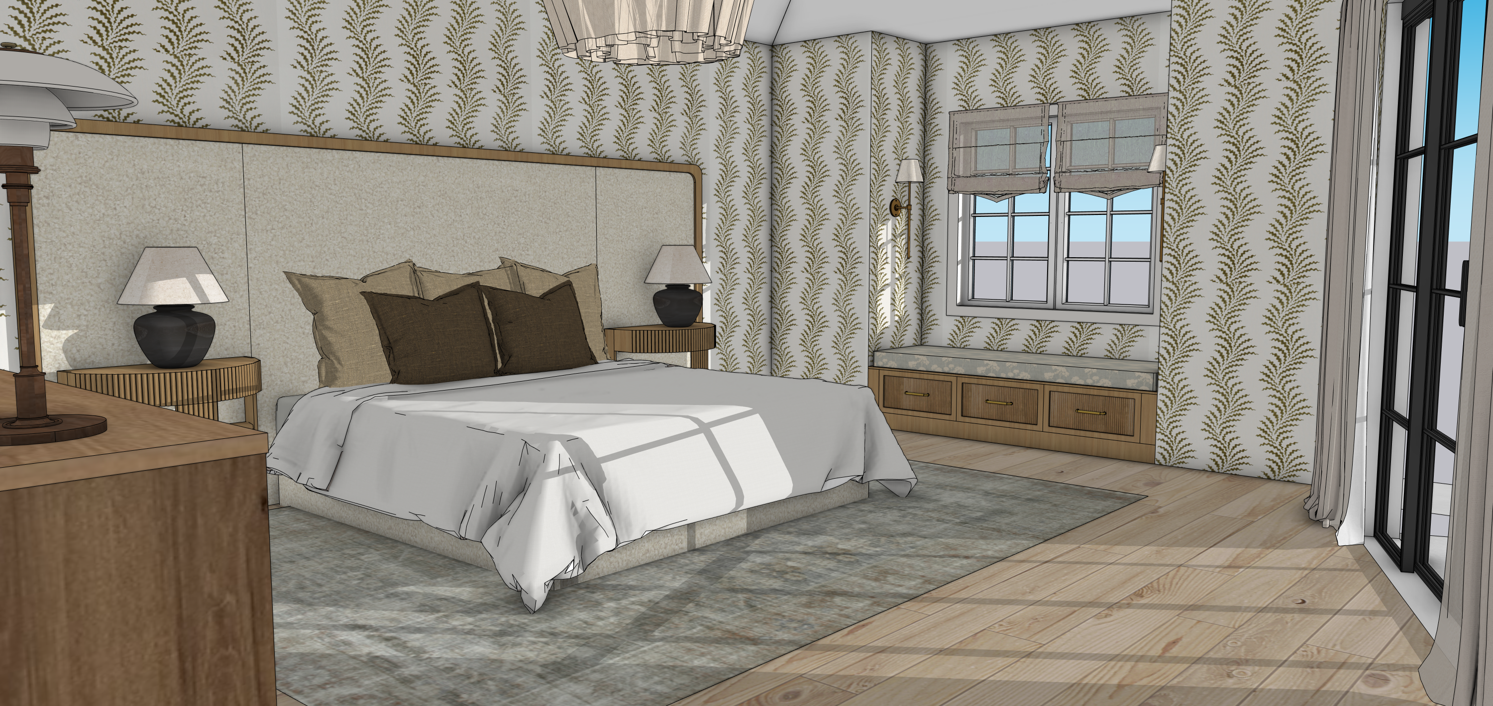 photorealistic interior bedroom rendering with elevated realism and soft natural daylight preserve the existing color palette layout and design intent improve material depth and realism while keeping tones calm and cohesive upholstered headboard and bedding should feel plush with natural fabric texture and relaxed drape wood furniture and flooring should show subtle grain and warmth wallpaper should retain pattern clarity with gentle depth not flat or graphic lighting should be balanced and realistic with soft shadows and no dramatic contrast overall result should feel like a refined high end residential interior not an early stage 3d model