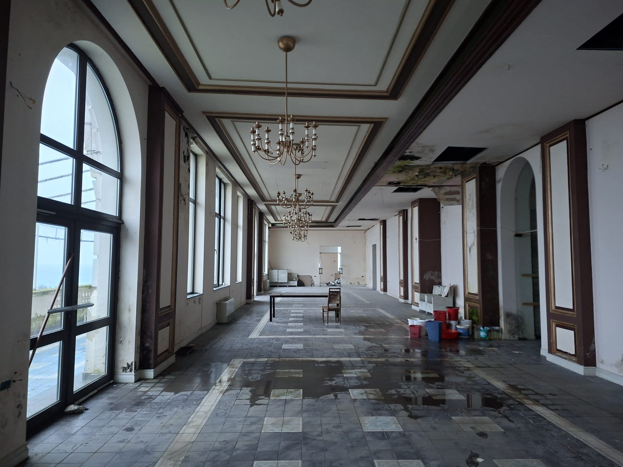 transform the empty distressed reference room into a fully renovated operational fine dining restaurant interior inside an ultra luxury european grand hotel completely restore and clean all surfaces repair walls ceilings and floors remove all signs of decay dirt damage and abandonment upgrade materials to refined luxury finishes while preserving the original architectural layout and room proportions redesign the space using the visual language of a palatial european grand hotel interior with strong axial symmetry rhythmic wall articulation repeated classical wall bays deep wall reveals refined cornices and paneling ceremonial corridor like elegance translated into a restaurant setting restrained neoclassical european classicism with architectural order and hierarchy cream and warm ivory wall paneling with ornate classical moldings and subtle gold trim black lacquer doors with polished brass hardware marble floors with black and gold geometric inlay high ceilings with coffered details restrained architectural ornamentation no floral patterns no floral wallpaper no floral upholstery no decorative flowers or botanical motifs anywhere in the scene furnish and stage the space as a complete fine dining restaurant inspired by grand hotel dining rooms with elegant dining tables arranged in symmetrical rows and axial compositions upholstered dining chairs in beige and champagne tones crisp white tablecloths refined place settings tableware and glassware formal circulation paths balanced spacing between tables a composed and ceremonial dining atmosphere suitable for a luxury palace hotel restaurant preserve and enhance the existing windows from the reference image as windows only maintain window proportions mullions frames and glazing keep all windows as architectural window openings with glass do not convert any windows into doors do not add extra doors preserve the original window placement and scale relative to the walls luxury lighting fixtures exclusively by eichholtz all chandeliers ceiling fixtures lamps and wall sconces in brushed or polished brass metal only no crystal elements no glass pendants no translucent materials classic brass silhouettes suitable for european grand hotel interiors layered lighting composition with primary chandeliers secondary wall sconces and soft ambient illumination warm golden ambient lighting soft cinematic shadows refined palace hotel restaurant atmosphere ultra photorealistic 24mm wide angle architectural photography extremely detailed textures aggressively correct perspective distortion and lens warping from the reference photo fully straighten vertical lines and window frames perfectly level the horizon realign walls and ceiling lines to true vertical and horizontal geometry remove camera tilt and keystone distortion professional architectural rectification clean orthographic alignment symmetrical composition preserve the original room layout and spatial proportions while correcting all skewed geometry