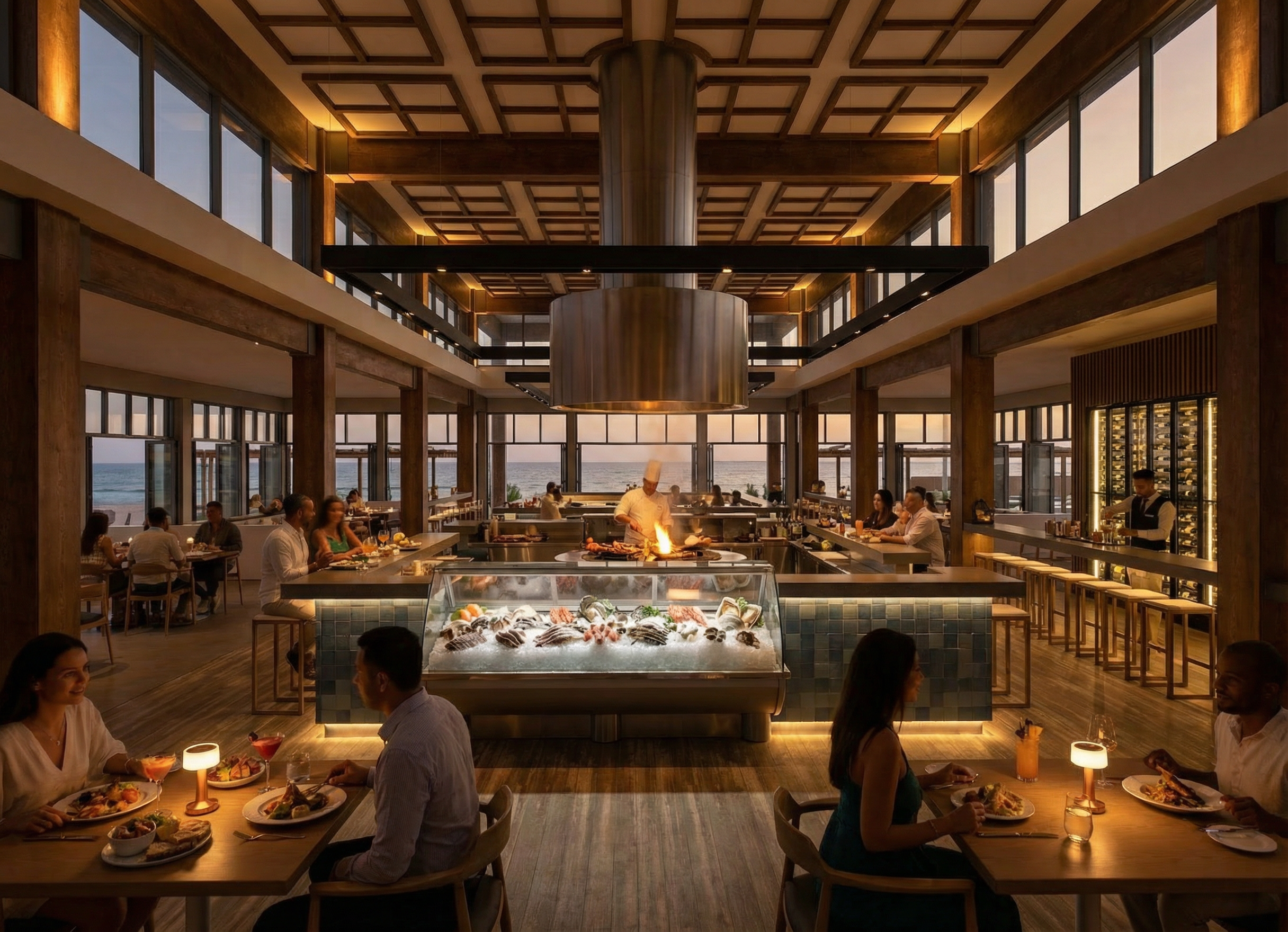 without changing colors sizes textures fixtures add underlighting under the floating canopy add bar stools with people sitting around the bar add a bartender and liquor bottles on the shelves