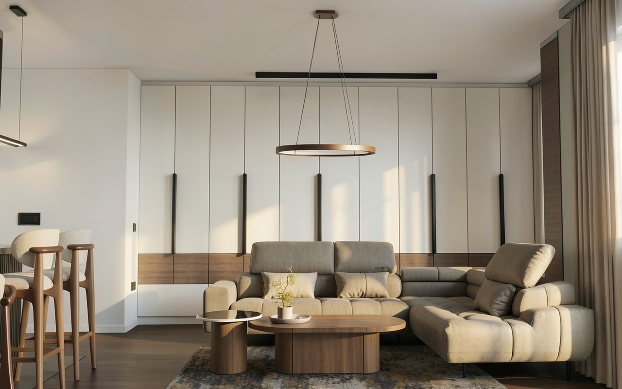 photorealistic architectural rendering prompt transform this architectural interior image into a highly photorealistic render while strictly preserving the original design layout and composition composition rules very important keep the exact camera angle perspective proportions and spatial layout of the original image do not move remove resize or replace any furniture or architectural elements do not change the distribution of the space the final render must remain faithful to the original scene scene description a mid century inspired dining and kitchen space inside a renovated apartment the space includes a large wooden dining table original dining chairs that must remain exactly as shown in the reference image a custom wall shelving system integrated into wooden paneling a central kitchen island partially visible a large artwork on the wall minimalist pendant lighting warm neutral interior walls wood flooring in the dining area checkered tile flooring in the kitchen area furniture the chair in the foreground is a black wassily chair tubular polished chrome metal frame highly reflective metal finish black leather seat and backrest realistic leather texture and reflections shelving and decoration the shelving system should include minimal mid century decorative elements arranged carefully architecture and design books small ceramic objects subtle decorative pieces decoration must be balanced and aesthetic without overcrowding the shelves lighting details the red table lamp placed on the shelf must be turned on emitting a warm glow the shelving system must have integrated led lighting behind the shelves producing a soft indirect light that highlights the books and objects exterior view through the windows and balcony doors show a realistic view of barcelona s eixample district including classic eixample residential buildings stone fa ades wrought iron balconies soft mediterranean daylight materials natural wood shelving with visible grain matte neutral walls wooden dining table chrome reflections on the wassily chair realistic wood parquet flooring lighting atmosphere all lights are on and space feel iluminated warm interior lighting 3000k soft global illumination natural daylight from the windows subtle shadows architectural interior photography look rendering style photorealistic architectural visualization ultra realistic materials ray tracing global illumination interior photography natural color grading soft warm light high detail textures 8k negative prompt no layout changes no moved furniture no different dining chairs no new furniture no altered architecture no surreal elements no distorted geometry