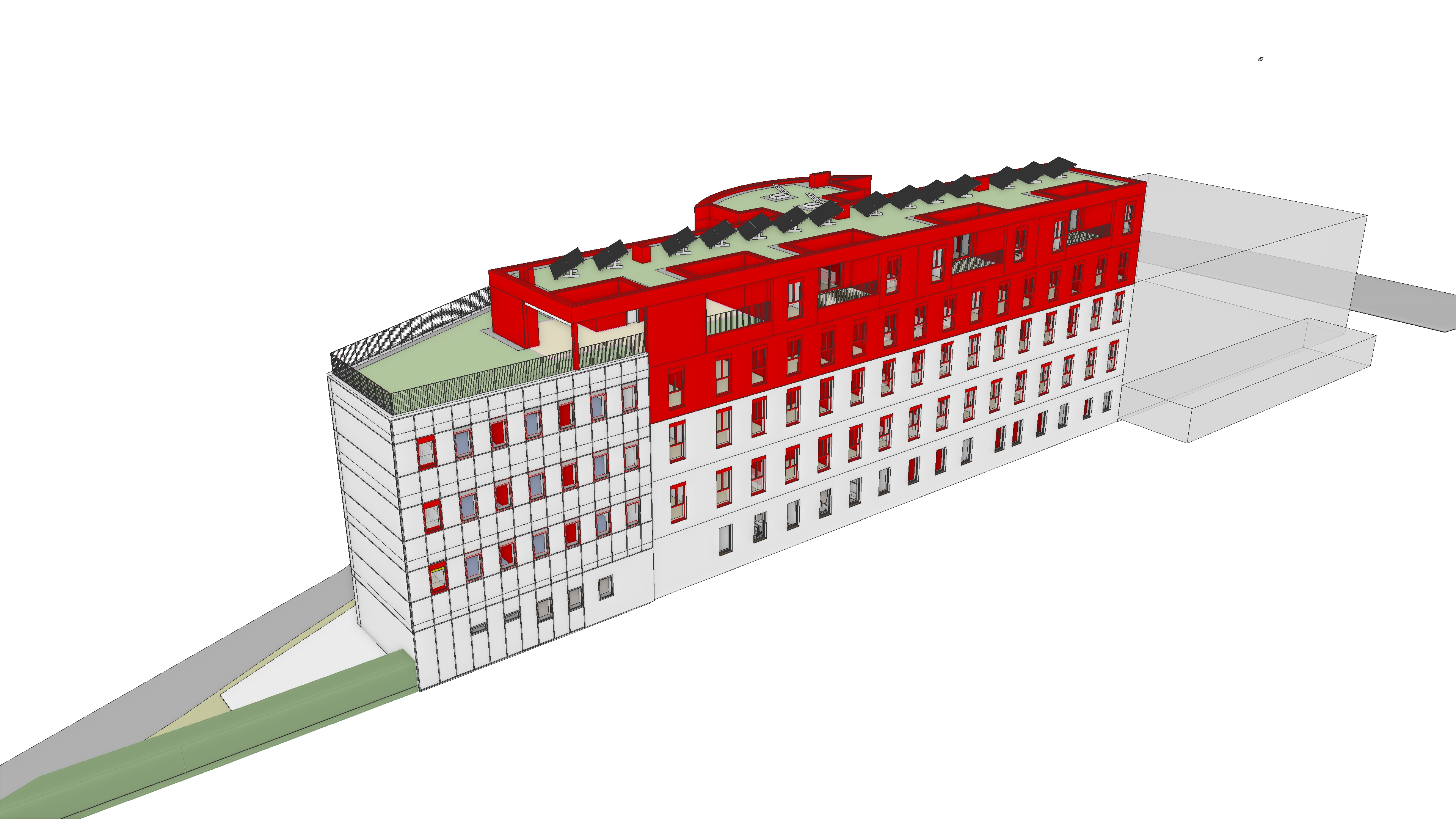 white facade partially suspended vertical planting rounded tower with mic inscription urban surroundings