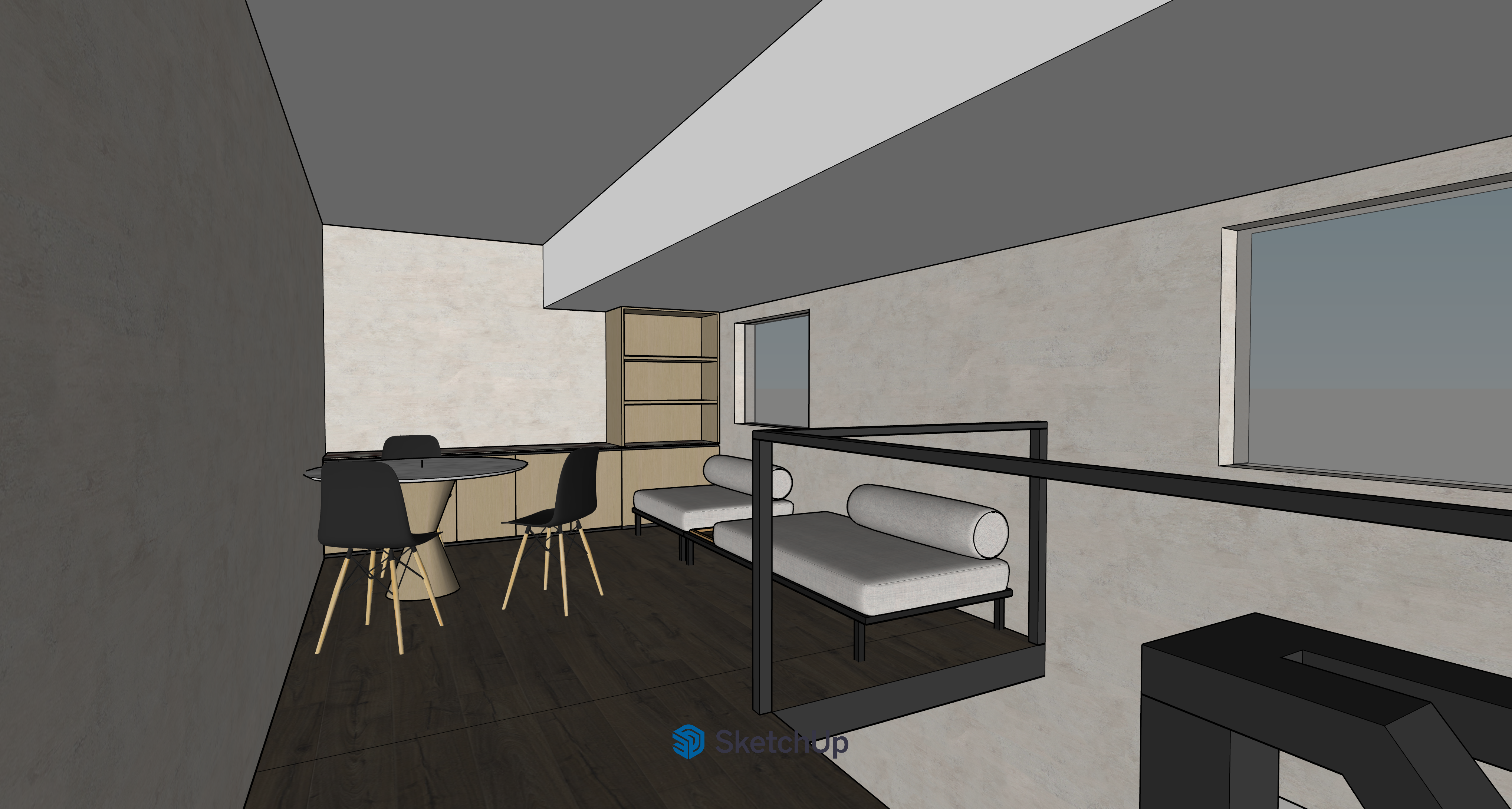 photorealistic render of a modern dining room with a cozy sophisticated atmosphere the walls are textured in light taupe venetian plaster the ceiling is a smooth white cabinets and bookcase are a light oak wood the countertop is calacatta viola marble round dining table is white top and base nearby is a lounge sofa is boucle fabric and black steel legs the stairs steps and handrails is back steel the floor is a rich espresso hardwood the lighting is soft and ambient creating a warm inviting wabi sabi vibe