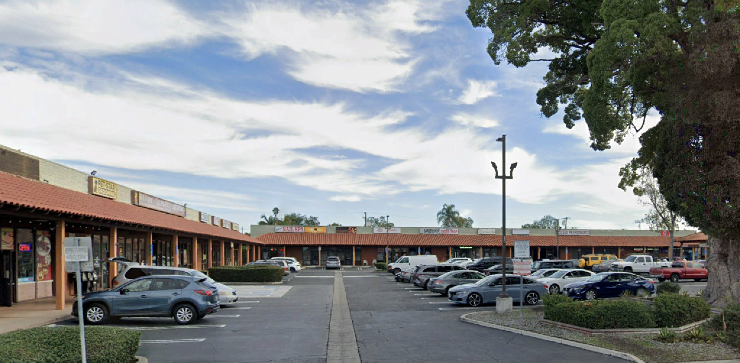 minimalism exterior shot a charming suburban shopping plaza under a bright partly cloudy sky use a soothing color palette warm terracotta for the tiled roofs soft beige and light brown for the walls and a variety of muted grays for the parked cars the trees are a lush vibrant green adding a touch of nature capture a serene peaceful atmosphere with soft shadows and diffused sunlight architecture