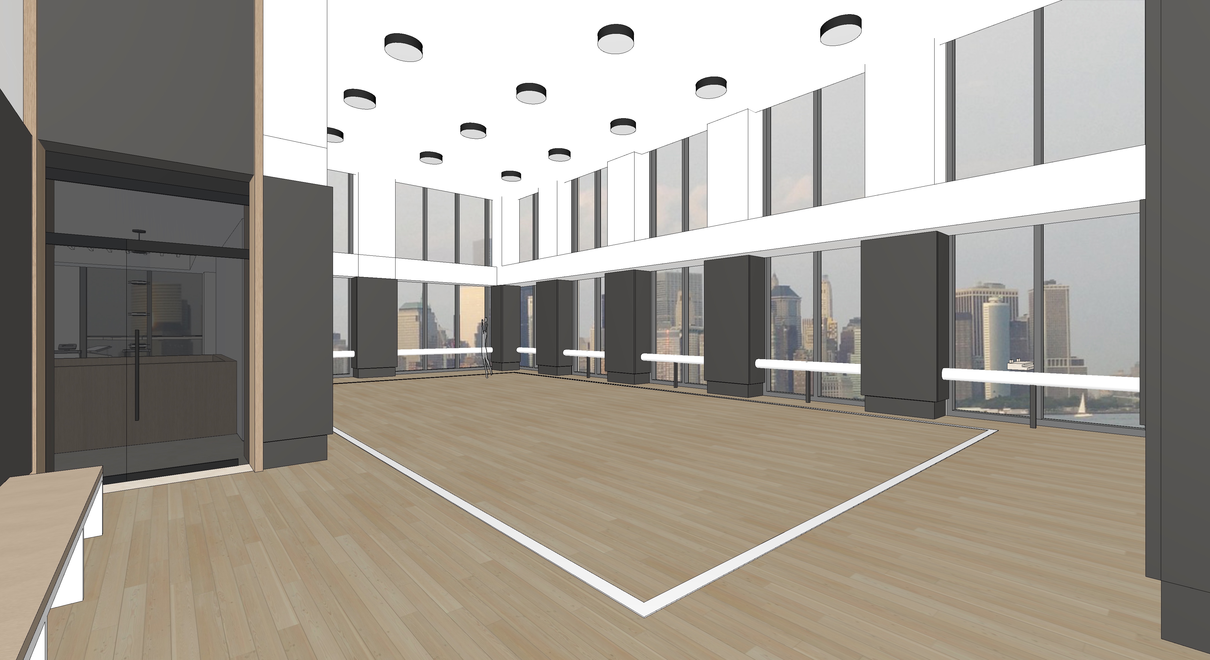 render a modern spacious basketball court with high ceilings and large glass windows offering a breathtaking cityscape view the atmosphere is serene and elegant with natural light flooding the space the walls are a sleek dark gray padded panels complemented by warm light wood flooring the ceiling lights are stylish black and white fixtures creating a sophisticated ambiance the studio features minimalistic decor with subtle hints of urban sophistication and white padded leather handrails accentuate the large windows