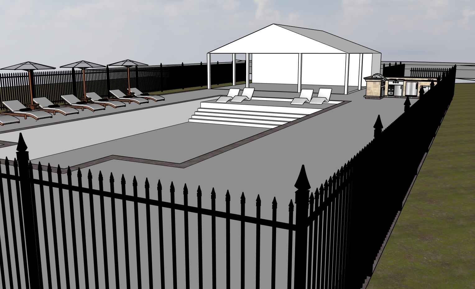create a serene outdoor scene with a luxurious swimming pool surrounded by a sleek black fence the pool should sparkle with clear azure water reflecting the sunlight arrange elegant white sun loungers with dark wooden frames under chic grey umbrellas add a stylish stone barbecue grill nearby on a smooth pale grey patio in the background place lush green trees to form a picturesque border and set the scene under a bright blue sky with soft clouds evoking a tranquil and inviting atmosphere architecture