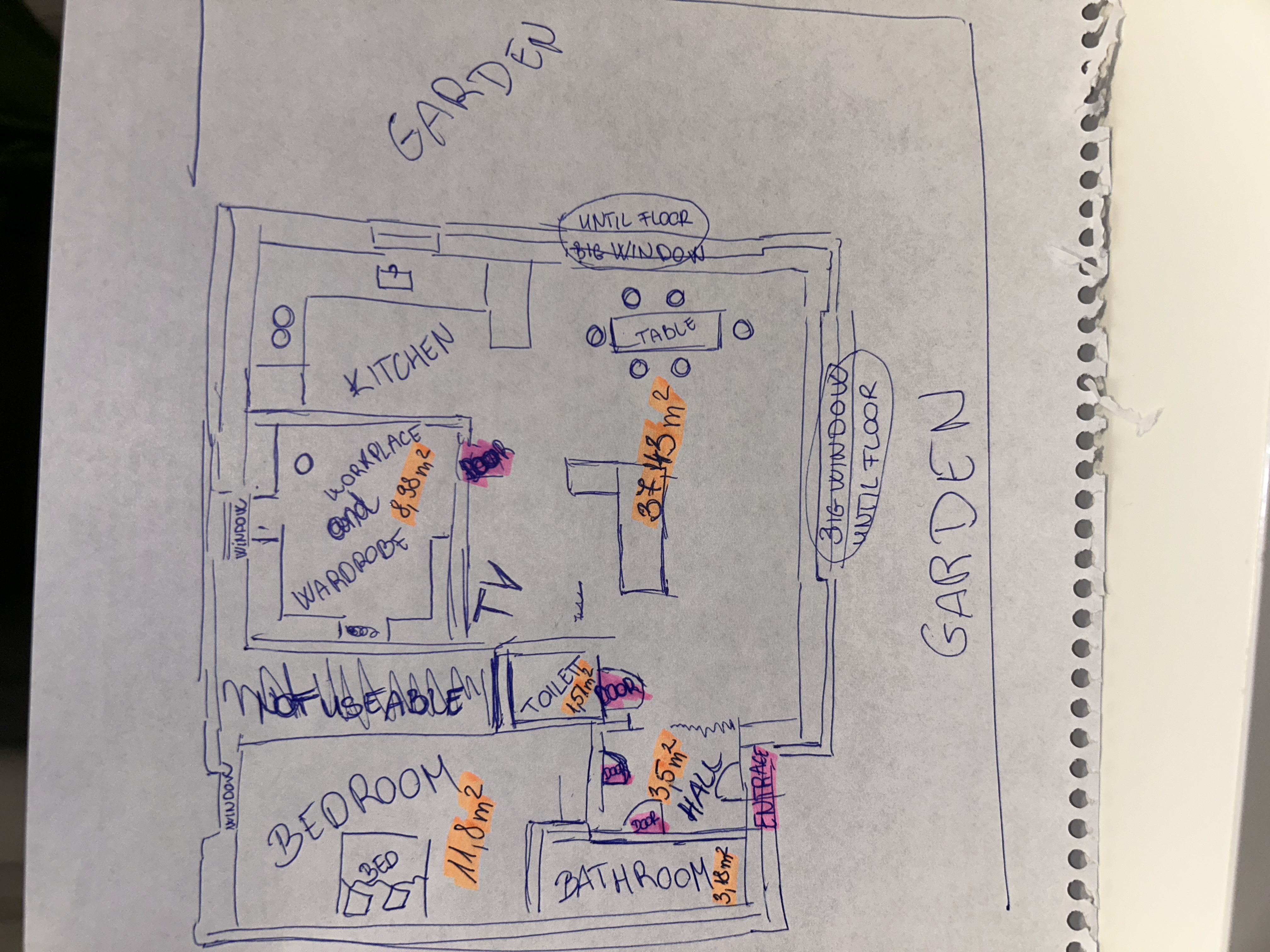 convert this floor plan into a realistic isometric 3d view of a full house show the space from an elevated angle with furniture walls and details visible warm nordic minimal luxury the kitchen is high lighted beige color use the same furniture as shows on the plan do not change the orientation of the floorplan