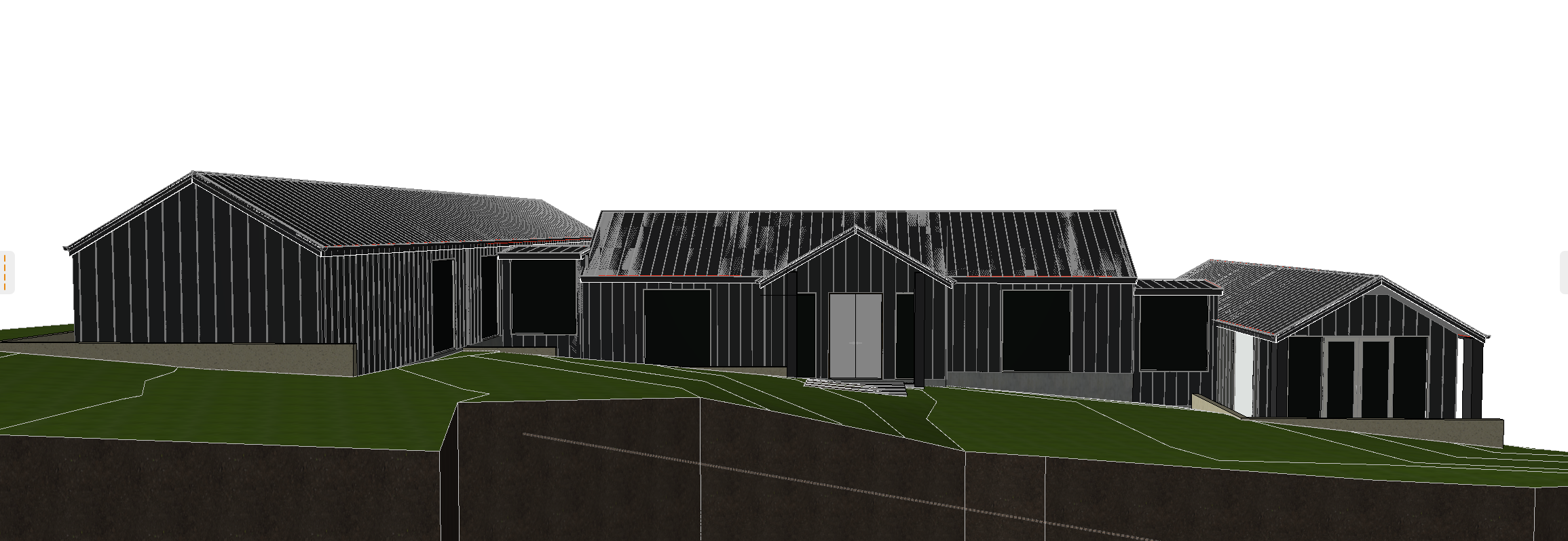 transform this screenshot from archicad into a high resolution render of a house the image shows the front of the house include lots of landscaping the house has a mix of dark vertical metal cladding and feature stone