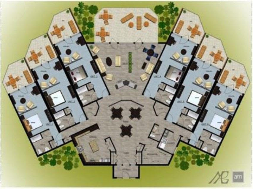 create a modular home site with green grass trees and gardens all around the homes add a playgound and park and some people outside
