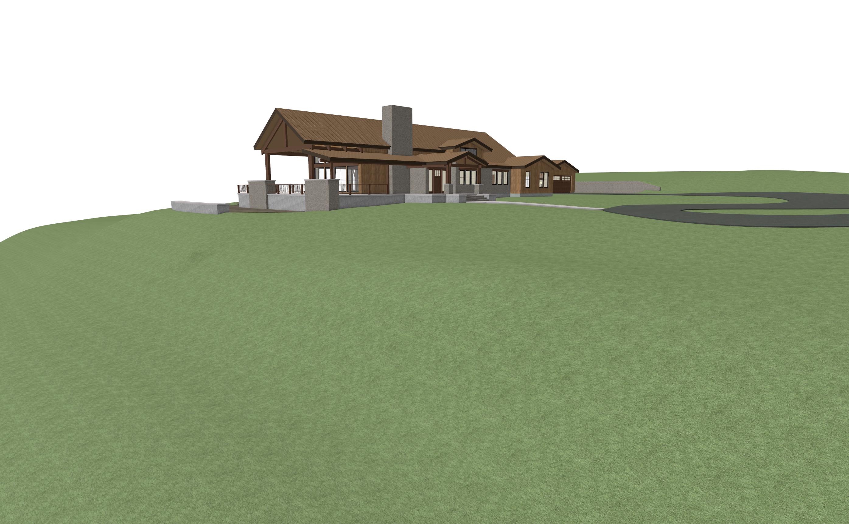 this in montana use native montana trees and vegetation make siding ghost wood like jackson hole keep rock on small gable bump out make golden hour outside show golden light coming from inside make roof copper standing seam roof make concrete on foundation rock material do not change the shape of the structur or window sizes there is no angled web in timber truss there is only the center vertical king post in timber trusses there is rock slab patio on left side of porch keep rock on walls and chimney
