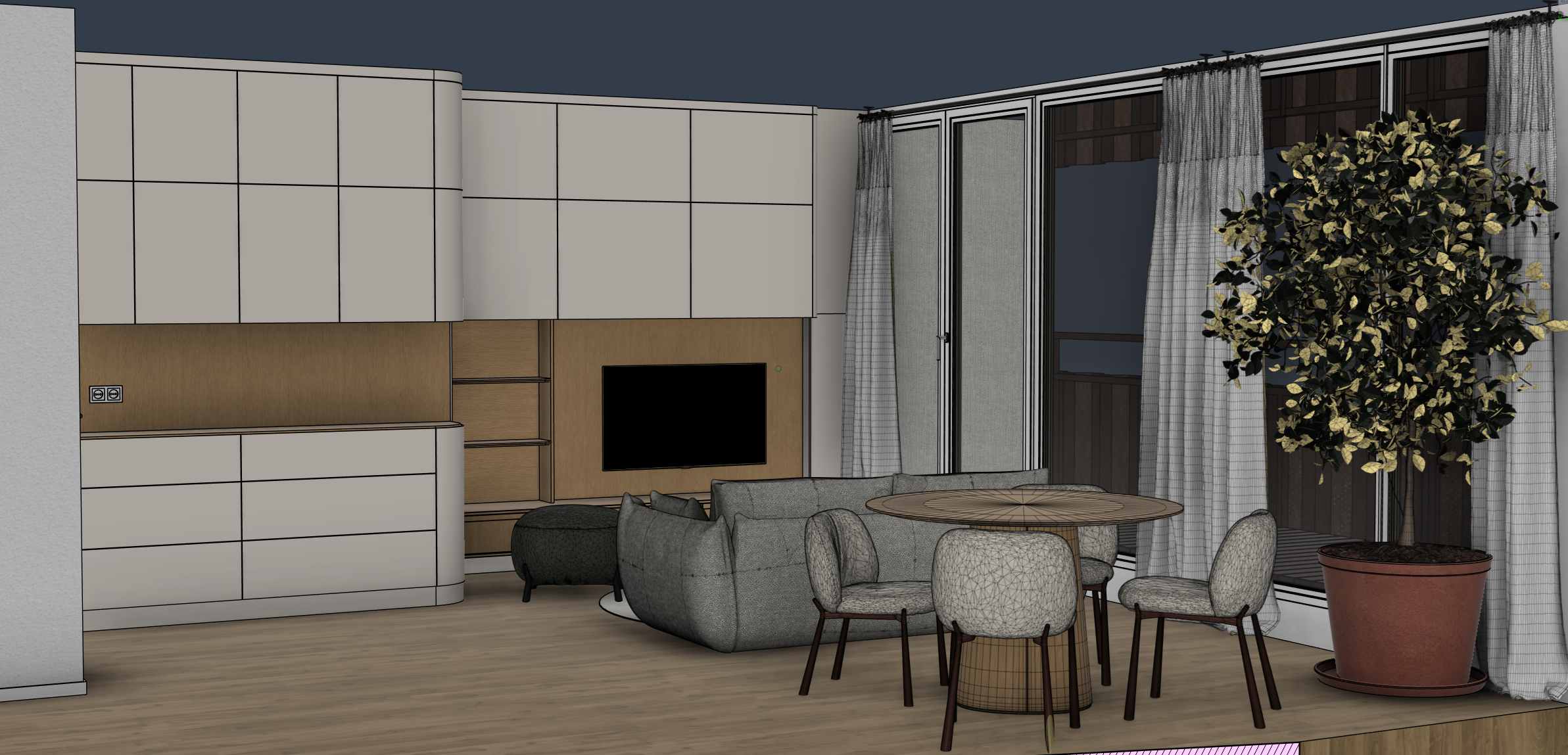 use the provided image strictly as the base for composition camera angle furniture placement and room geometry do not change the layout proportions object positions or architecture add soft natural sunlight entering the room creating gentle sunlight patches and soft realistic shadows across the interior the light should feel warm natural and subtle improving the atmosphere without becoming too strong or overexposed the furniture has a chalk colored finish combined with oak wood elements the oak wood has a natural oak grain texture with a vertical grain direction on the right side of the scene there are dining chairs upholstered in white boucl fabric with a clearly visible textured surface the chair legs have a brownish red color behind the chairs there is a light grey sofa next to the sofa a dark green ottoman is partially visible the dining table is made of oak wood with natural oak grain the floor is also oak wood with a natural wood texture on the far right side of the scene there are light white glazed doors and light white wall switches remove any visible mesh lines polygon edges or modeling artifacts from objects especially the sofa and other furniture surfaces should appear smooth and realistic without visible 3d mesh structure focus on improving natural lighting material realism soft shadows and overall photorealistic rendering quality while keeping the original scene unchanged