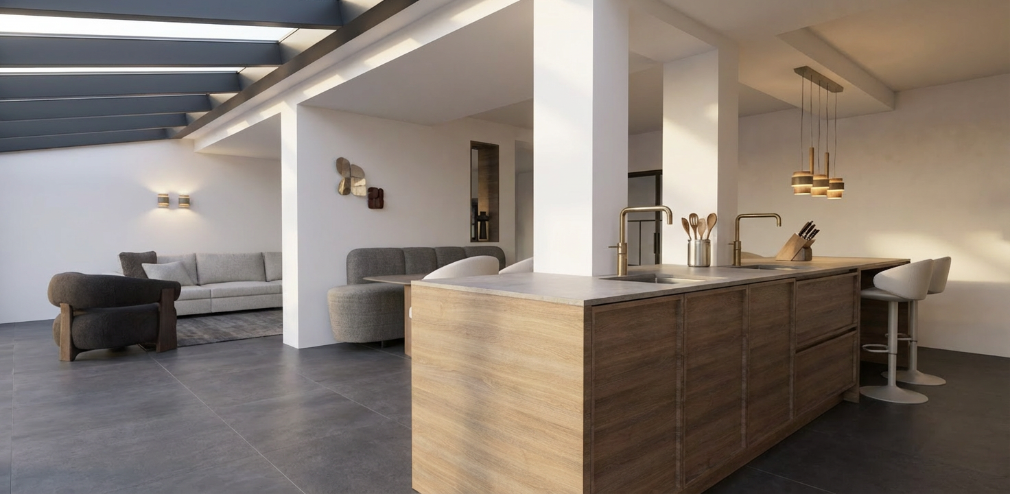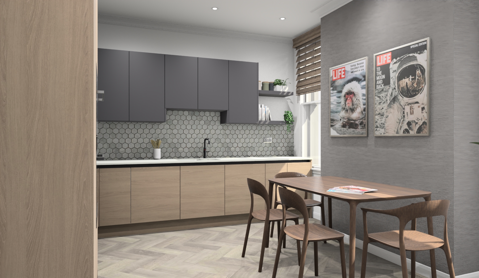 make this image 8k hyper realistic as if it were taken via an iphone camera artificial lighting should beautifully blend with natural lighting showing the subtle grain effect on the painted ash kitchen door keep dimensions the same and in a landscape format keep dimensions the same midday sunlight coming through large windows casting realistic shadows and reflections shot with a dslr camera 35mm lens shallow depth of field ultra high resolution photorealistic ray tracing global illumination highly detailed textures realistic lighting cinematic composition
