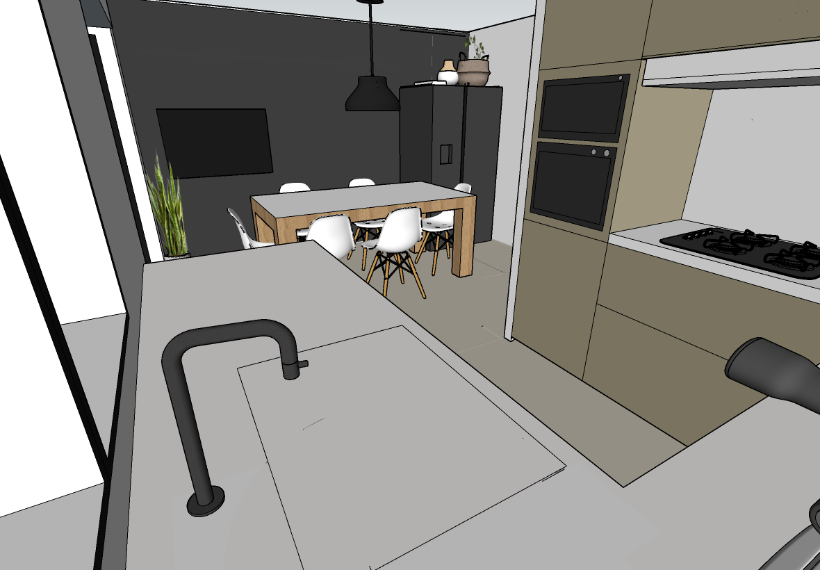 render a modern minimalist kitchen in a cozy inviting atmosphere use dark khaki tones for the cabinetry to create a modern warm and welcoming feel incorporate sleek matte black accents for the stove and appliances to add contrast and sophistication paint the walls with a soft white color to brighten the space and use warm wood tones for the open shelves to add natural texture the back wall is dark charcoal grey and has a large fridge freezer in dark steel on the right and tv on the left choose a bright white for the countertops and muted matte beige tiles for the floors ensure the room is softly lit with ambient lighting to enhance the cozy contemporary aesthetic