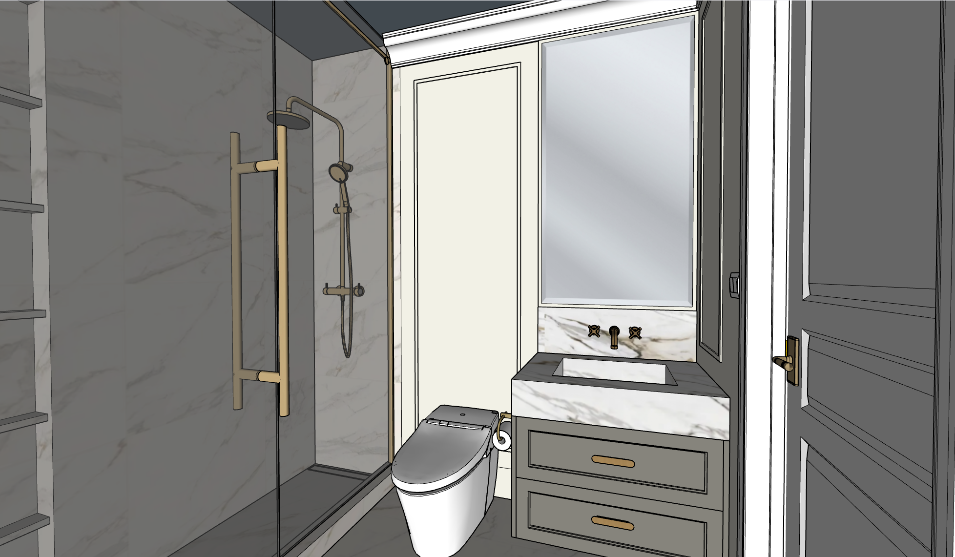 render and add photo realism walls are benjamin moore white dove ceiling is benjamin moore chantilly lace vanity is benjamin moore chelsea gray add a pot light in the bathroom add a pot light in the shower