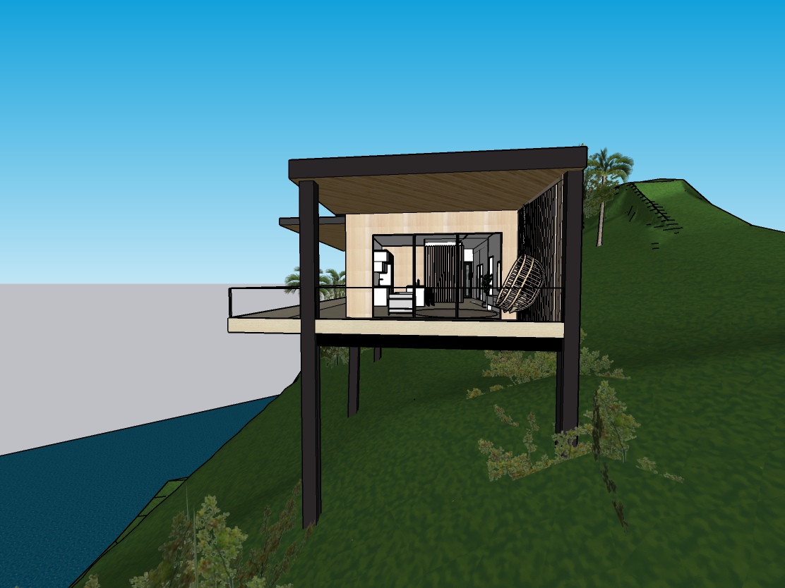 exterior shot create a stunning 3d render of a modern hillside house the structure features sleek dark brown wooden columns and a warm light beige bamboo cabin facade the cantilevered balcony overlooks a vibrant lush green landscape dotted with palm trees below the deep blue ocean reflects the bright azure sky soft ambient lighting creates a serene inviting atmosphere include details like a hanging wicker chair and large glass windows that offer a seamless connection to nature the overall mood is tranquil and modern set in a pristine natural environment
