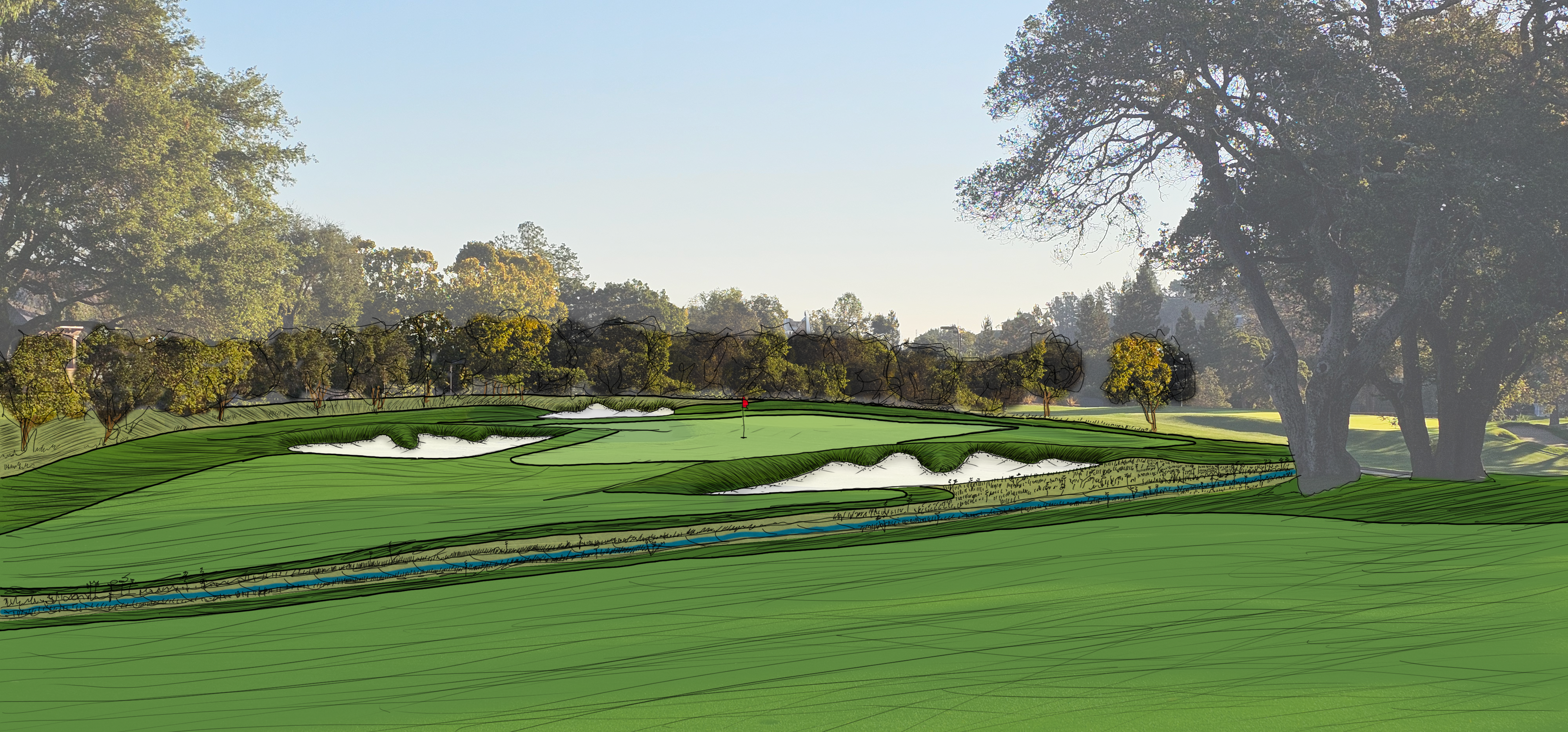 convert the image into a realistic photo perspective blend the sketch with the background maintain the position of all physical elements replace the sky with an early morning sunrise plant the creek with scattered small angular boulders and small plants appropriate for creek bank restoration and habitat emphasize 25 slope on the banks plant native grasses all long the banks the bank should be 8 feet wide ensure transparency through the understory of the trees through to the tennis courts marincountryclub novato golfcourse turf