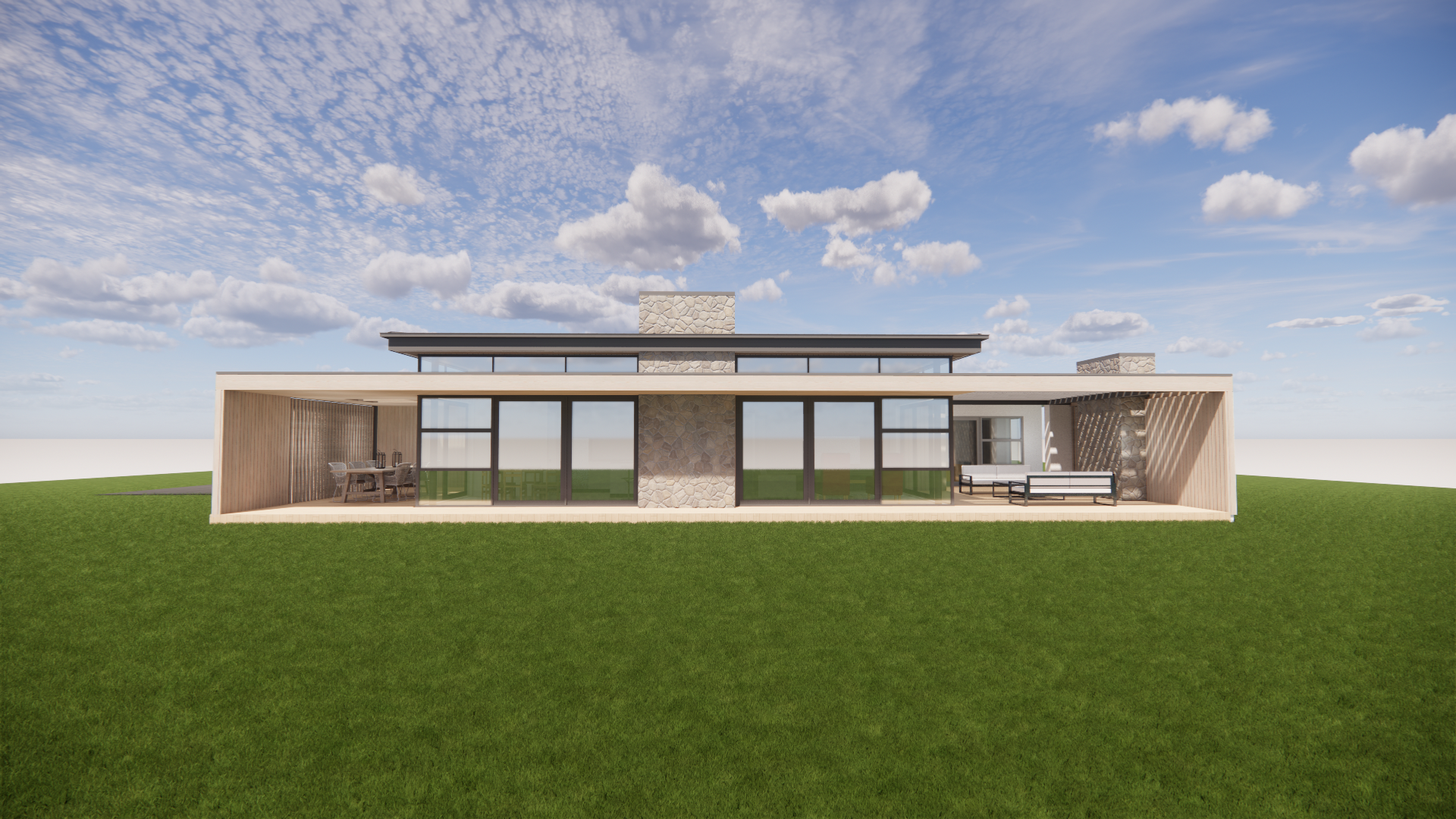 modern new zealand architectural home retain exact original house geometry proportions rooflines window placement and layout with no structural changes transform materials and rendering style to a high end landmark homes aesthetic exterior finishes updated to a refined palette warm vertical timber cladding in natural cedar tones contrasting dark charcoal vertical cladding and light textured plaster elements add a feature natural stone chimney and stone column in soft grey tones introduce timber slat screening detail near entry and outdoor living zones upgrade glazing to large black aluminium framed windows and sliding doors with high clarity glass ensure strong indoor outdoor flow is visually emphasised refine outdoor living areas clean minimal timber decking contemporary outdoor furniture styled in neutral tones subtle staging that feels realistic and not overdesigned apply modern new zealand landscaping structured but natural planting including grasses low shrubs and feature planting keep it restrained and architectural not dense or messy lighting soft warm late afternoon or early evening light slightly brighter than original render with gentle sun direction creating depth and shadow across the fa ade avoid overly dark or moody lighting sky clean with soft clouds camera retain same angle and perspective as original image do not change viewpoint rendering style high end photorealistic clean balanced contrast consistent with premium residential marketing imagery