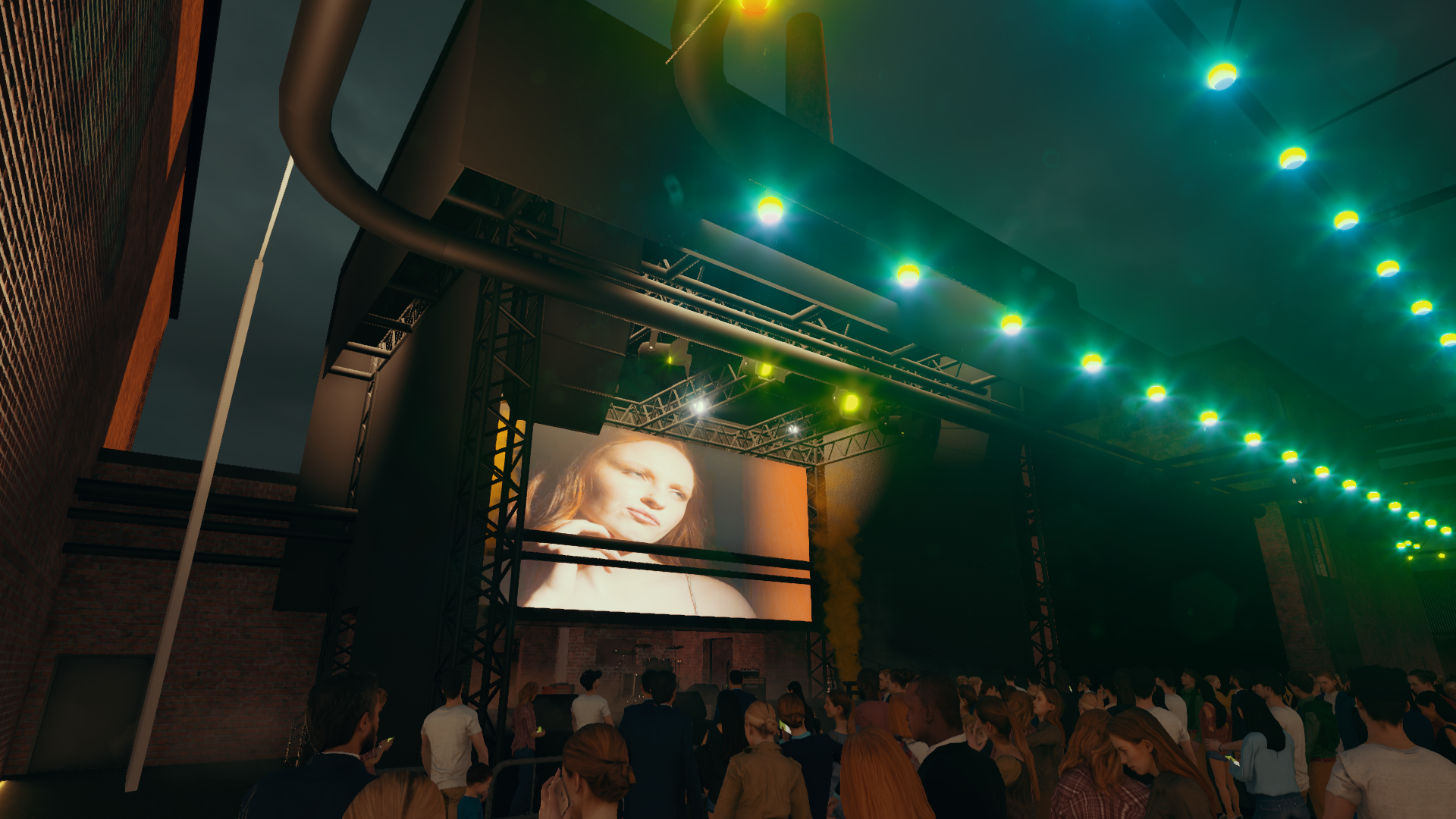 a hyper realistic low angle candid photograph capturing a dense crowd of diverse concert goers at an industrial style outdoor venue the camera is close to the crowd showing clear facial details expressions and authentic clothing with realistic skin textures and a tangible sense of a sweaty excited atmosphere in the background the large stage with its trussing and a massive led screen displays a detailed clear image of a female artist s face with a hand to her chin strings of teal and yellow stage lights dominate the frame casting realistic colored highlights and creating dramatic reflections in the eyes the brick factory building is visible lit by the dark overcast night sky cinematic depth of field natural film grain shot on a canon eos 1d x mark iii with soft bokeh high dynamic range people turn towards the projector