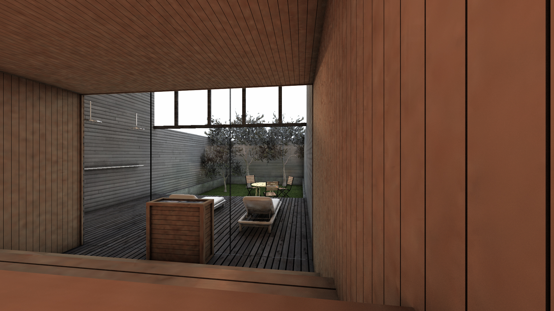 golden hour scene with warm soft evening sunlight casting long gentle shadows enhance the atmosphere with subtle artificial mood lighting integrated into the terrace and garden area such as indirect floor lights and soft wall lights the lighting should highlight the wooden textures the rising steam from the sauna oven and the running water from the showers overall ambiance calm exclusive and wellness inspired with a premium golden glow