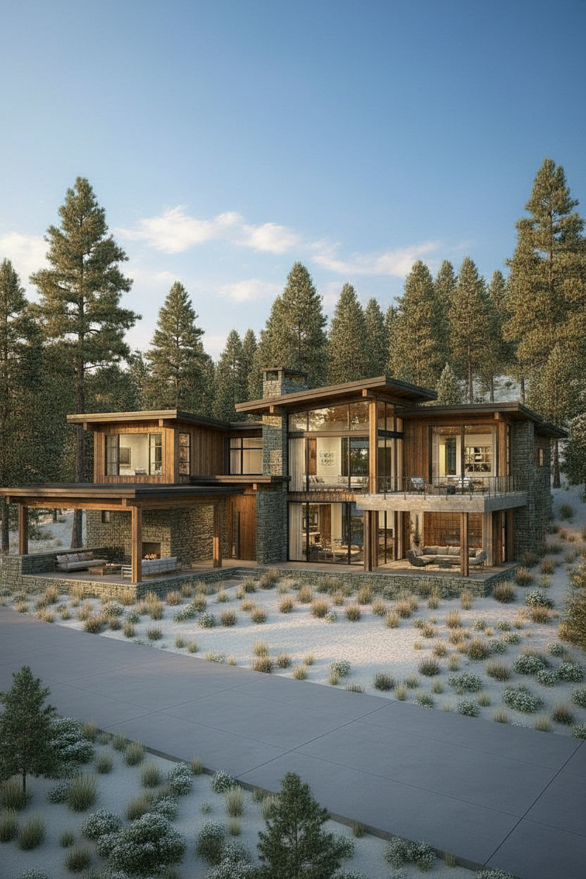 exterior shot render a photorealistic 3d perspective of this house in a truckee ca mountain contemporary style keep model geometry the same use natural wood stone and dark metal roof show sloped pine landscape granite and mountain light maintain form of the house including current windows doors and roof