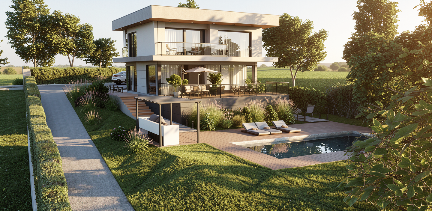match provided rendering style pen and ink style vs pencil black and white hand drawn rendering style no colors with large oak trees behind house sidewalk to front door