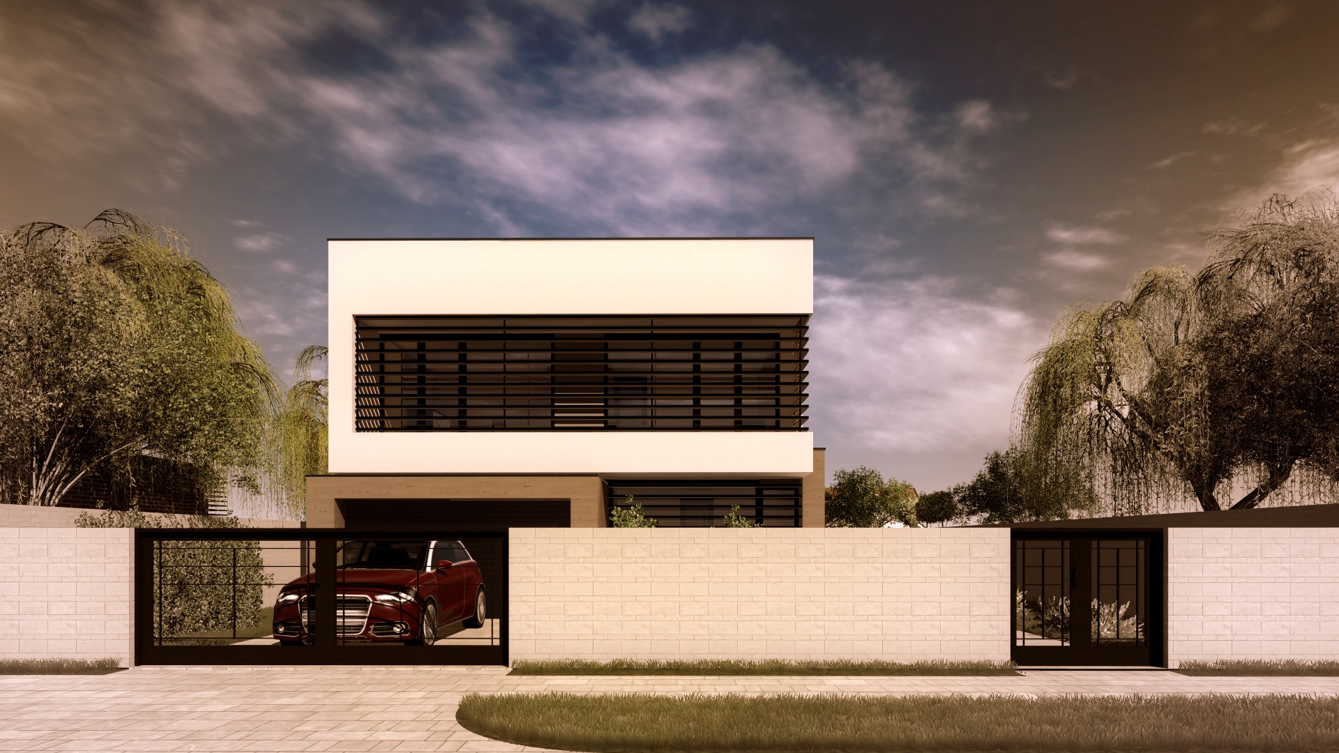 minimalism exterior shot smooth fassade autumn plants in background dawn mood architecture