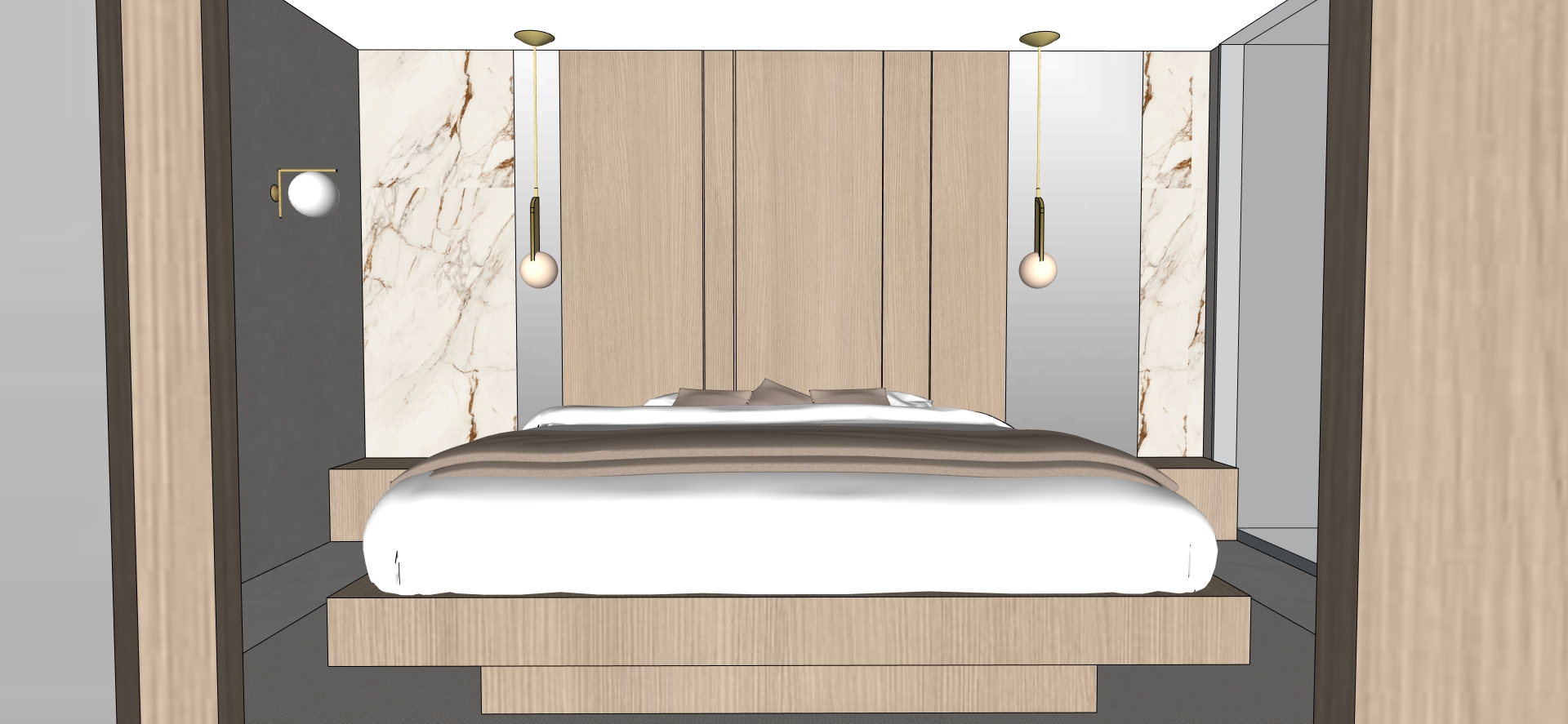maintain the original bedroom design layout and all materials from the uploaded sketchup image do not change furniture placement finishes or textures the grey wall areas are mirrors and must remain reflective mirror surfaces the area under the bed is a carpet rug and must remain soft carpet material use the reference image only as guidance for lighting style ceiling design and overall ambience follow the same lighting mood perspective feel and ceiling concept shown in the reference image add a simple modern ceiling with a subtle dropped perimeter detail to conceal the curtain rail similar to the reference image the ceiling should look clean and minimal introduce soft warm ambient lighting throughout the bedroom using pendant lights and wall lights lighting should be warm around 3000k soft and relaxing creating a calm bedroom atmosphere avoid harsh or overly bright lighting add soft elegant curtains with light fabric and gentle folds that feel airy and easy on the eyes keep all original textures and materials exactly as in the sketchup model only improving lighting realism reflections shadows and overall atmosphere maintain the same composition and camera view while achieving a highly realistic architectural render