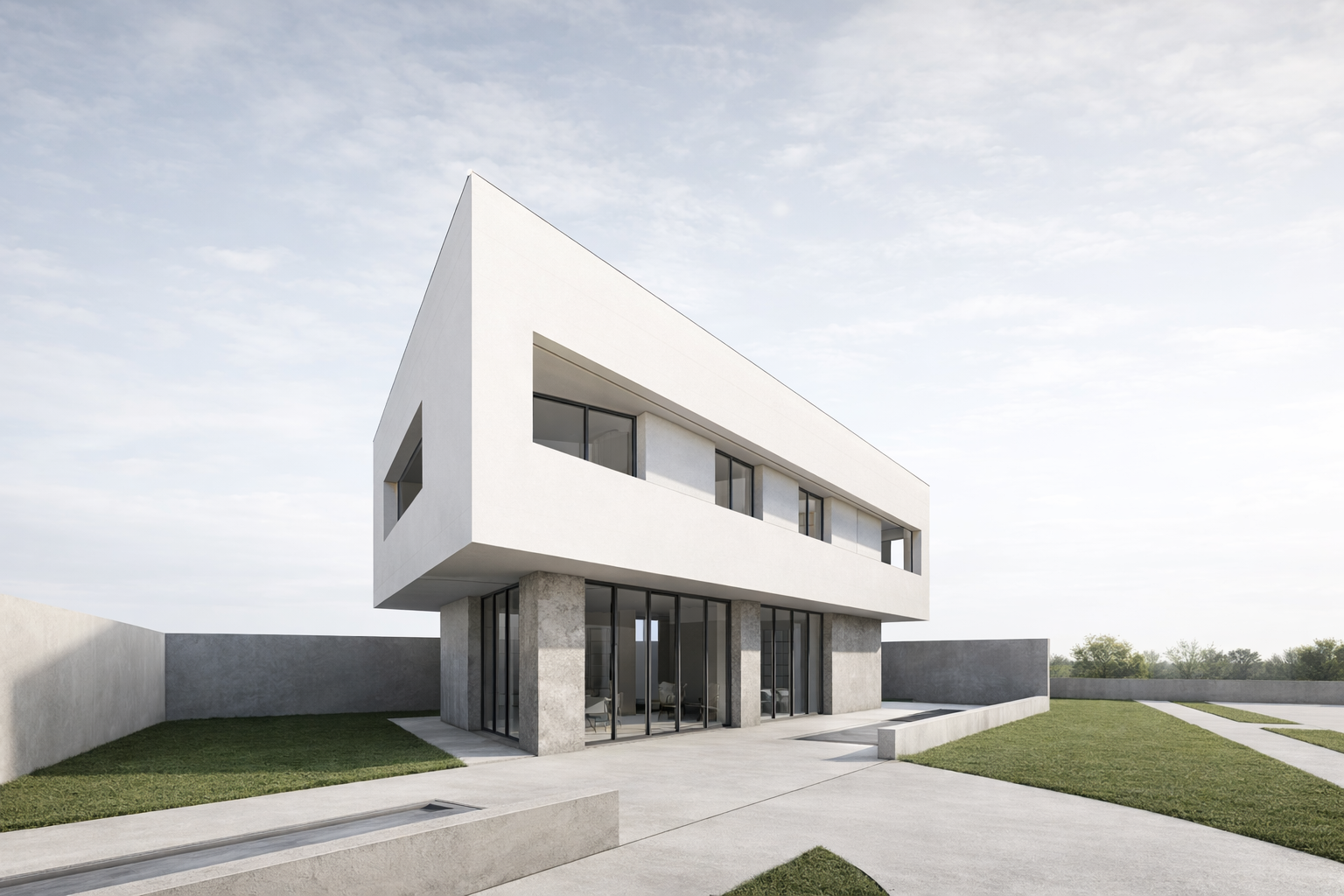 exterior shot use a metallic cladding for the upper part of the building use concrete for the ground storey