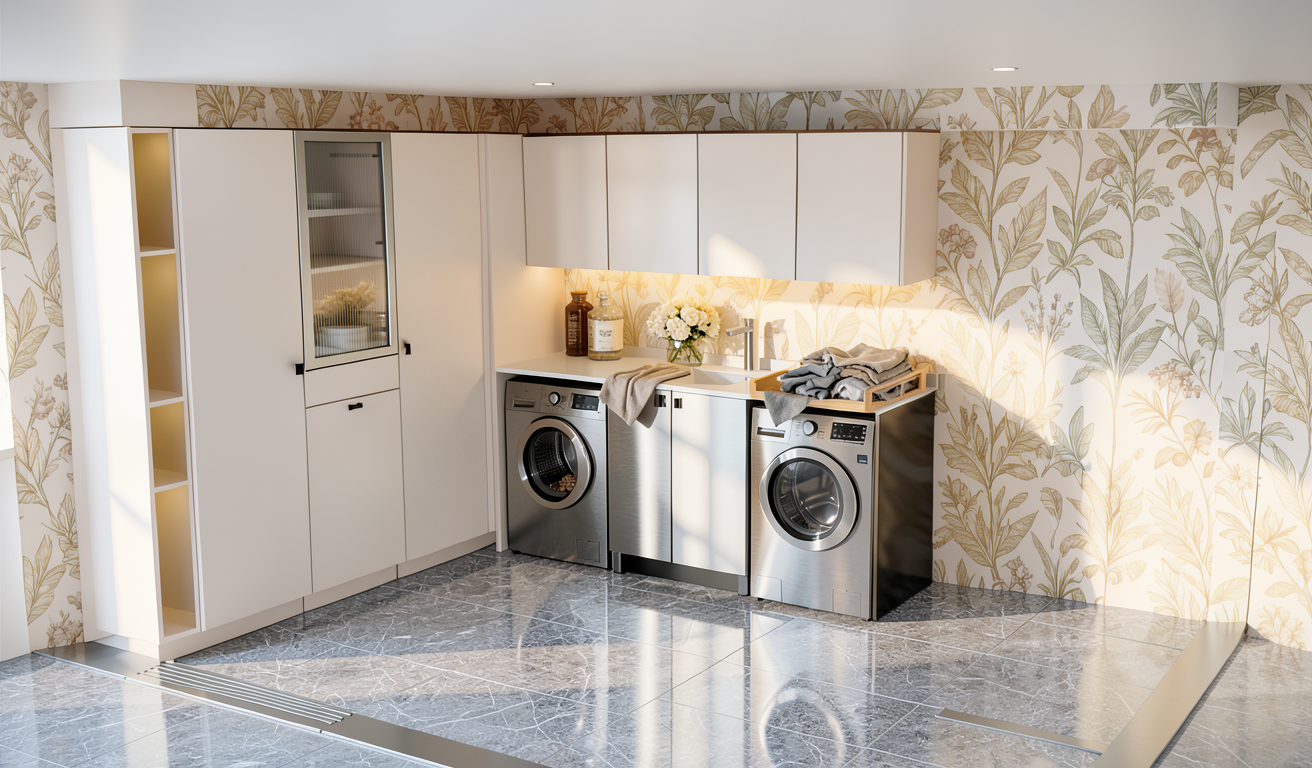 cambiame el color de la lavadoras por acero inox cambia el suelo a porcelanico con baldosa gran formato gris claro quiero que la columna sin puerta tenga 2 huecos