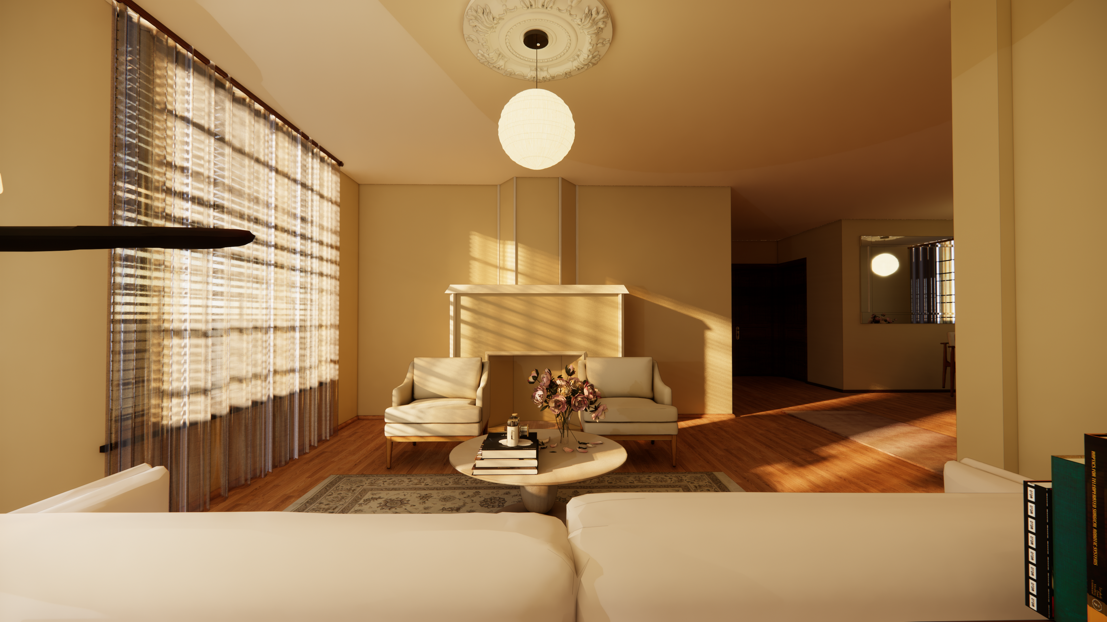 keep the objects in the scene but place golden sunlight through metal blinds on the curtains