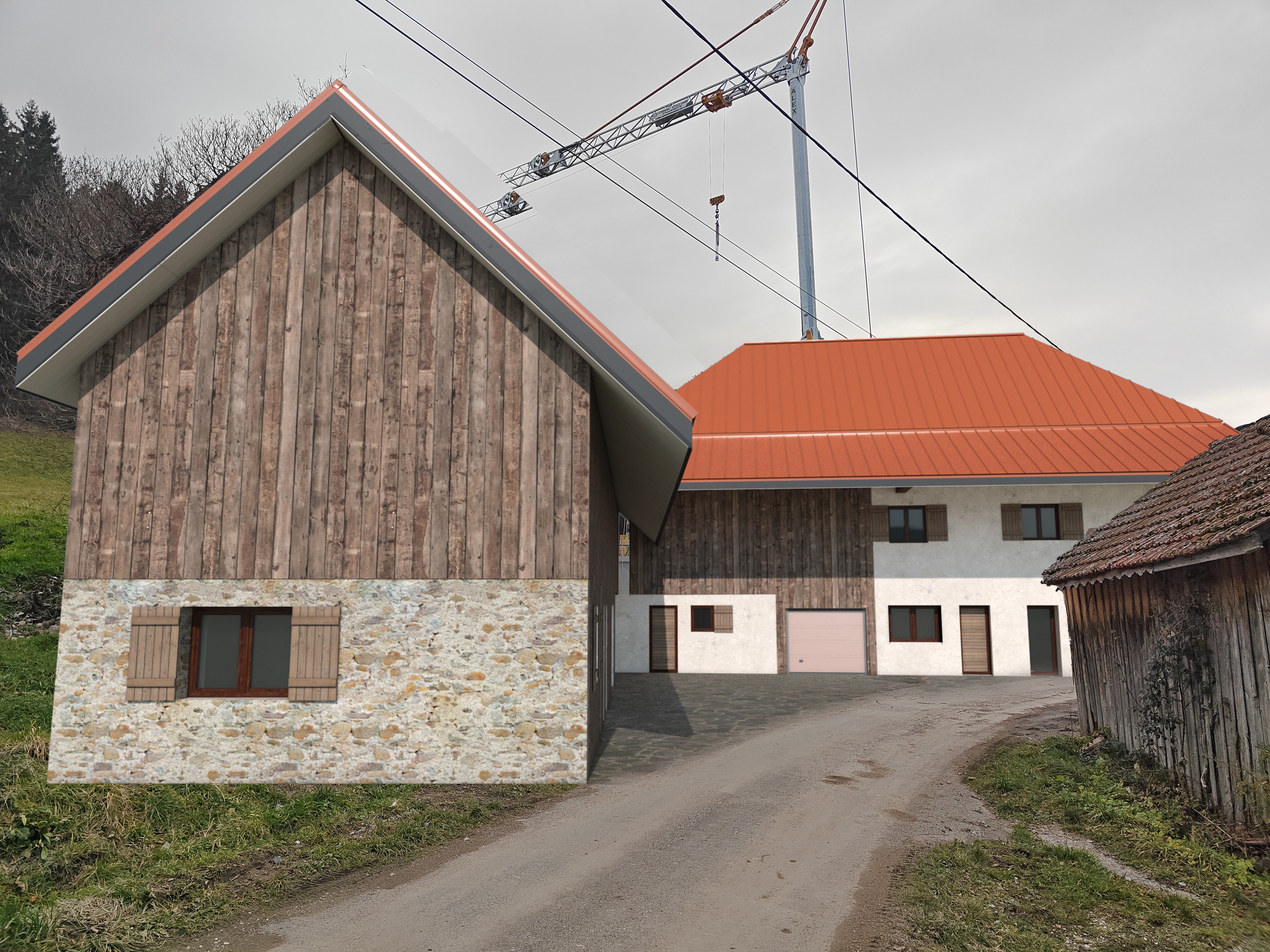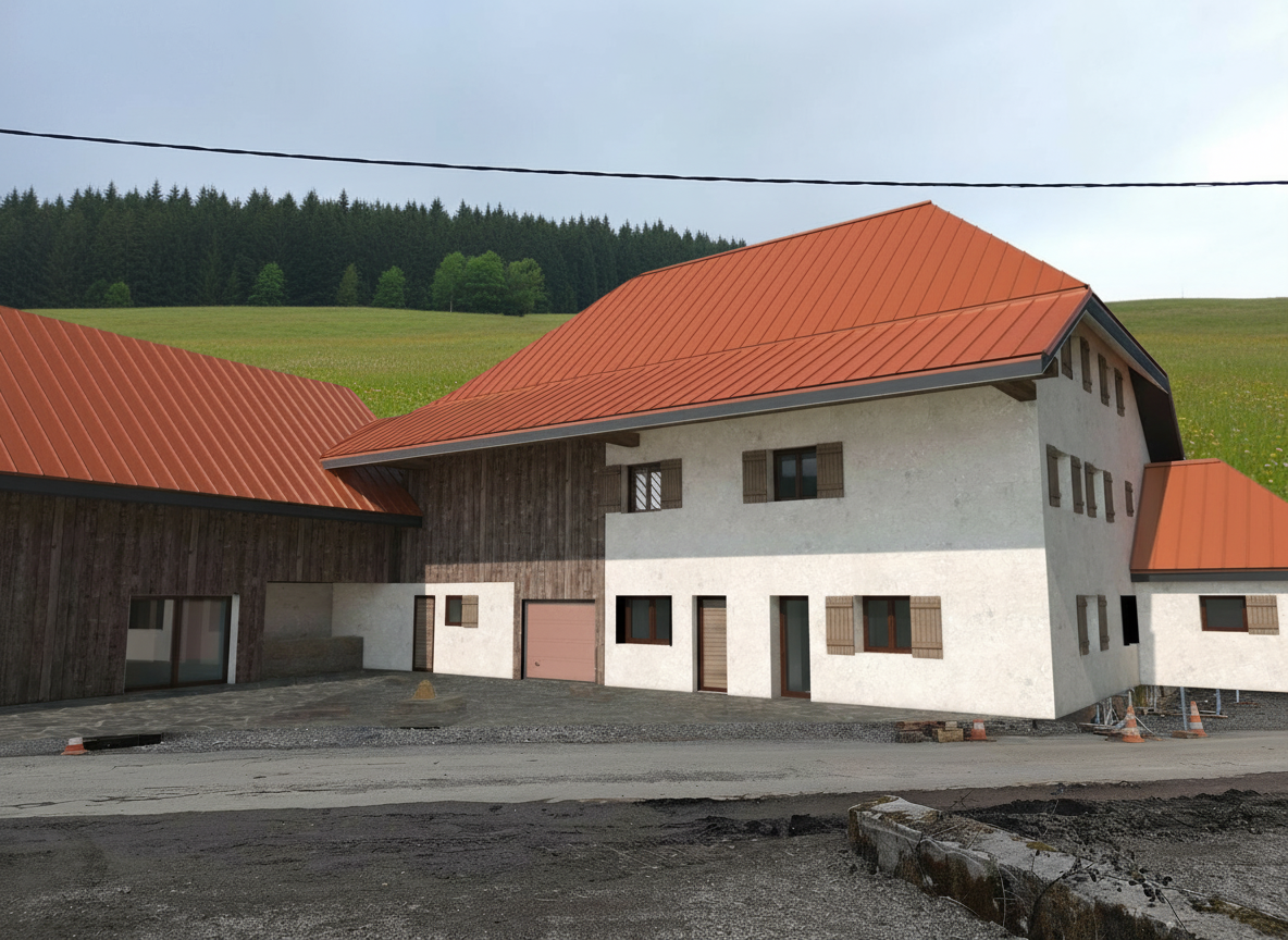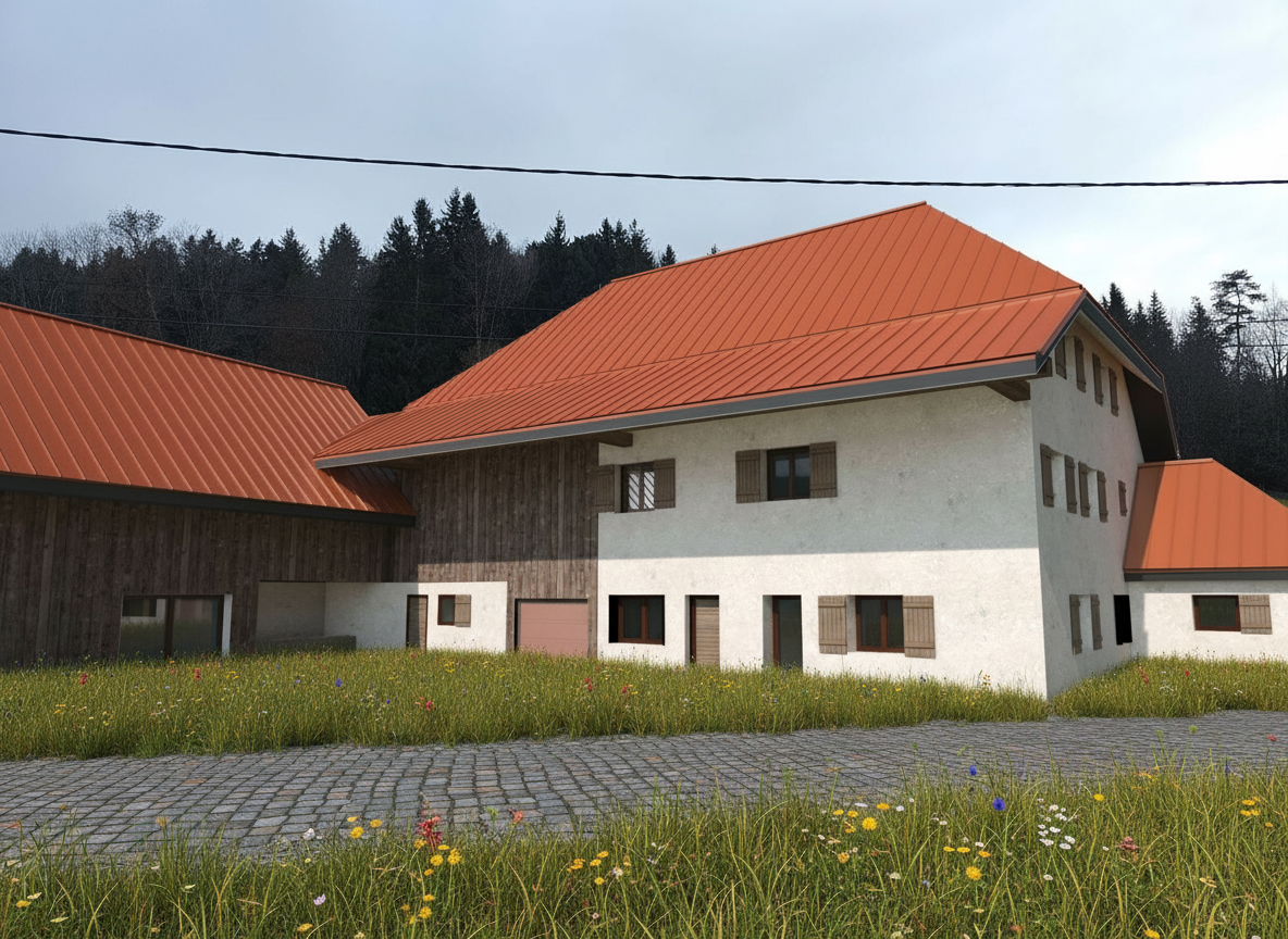 with the low wild grass the road remains in the same place construction work has been removed keep the road and cobblestones in the courtyard same trees in the background