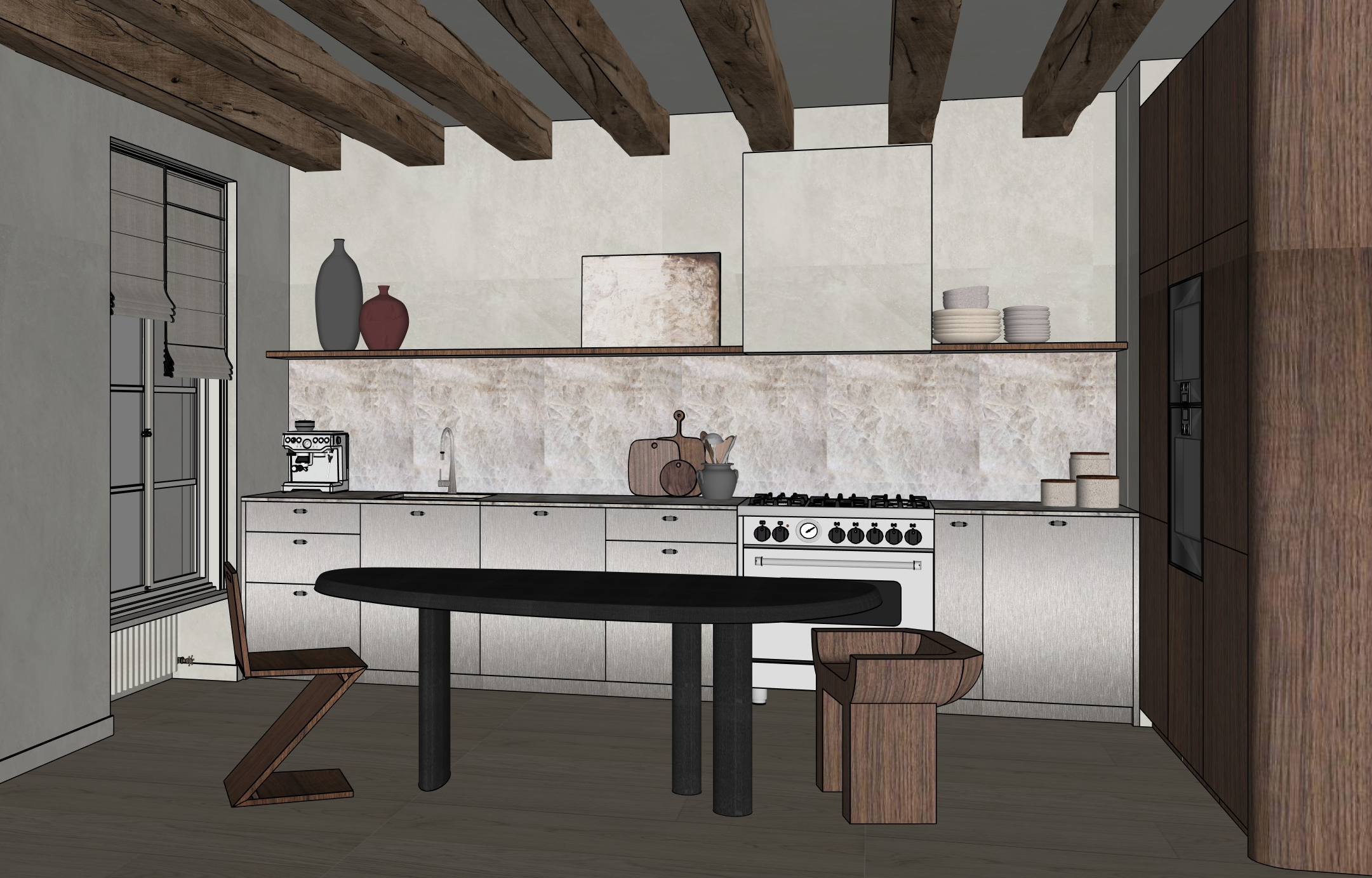 the walls should be lightly plastered the stone is more grey the appartment is in paris on the 3rd floor the stove is a lacanche range in stainless steel the cabinets are in stainless steel but not so shiny the colors of the room should be more beige and a little brighter style the space like colin king the floor is in ancient wood the range hood is the same color as the walls and is lightly plastered add some subtle lights