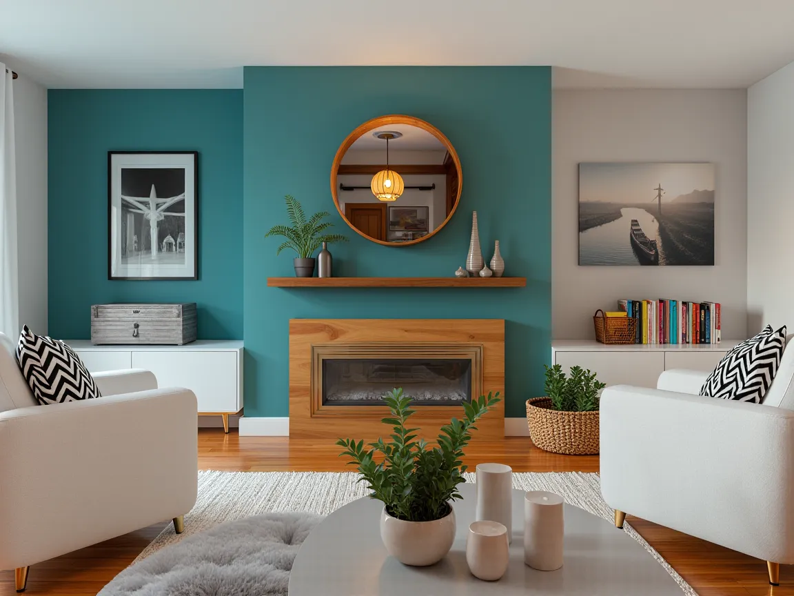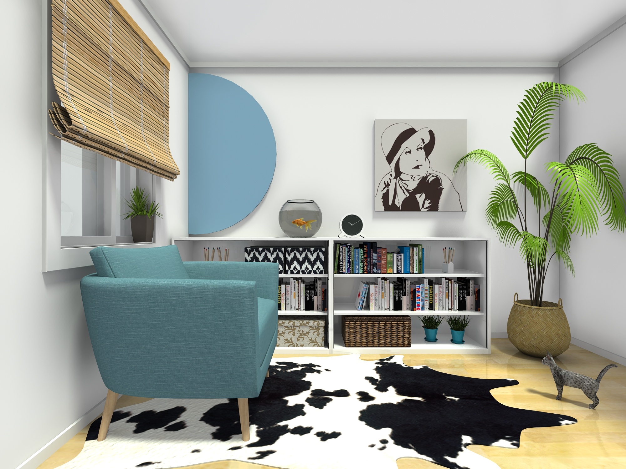 this image depicts a modern and cozy corner of a room with a stylish minimalist design the room features a teal armchair with wooden legs placed next to a large window covered by a bamboo style blind a small plant sits on the windowsill adding a touch of greenery to the right there is a blue accent wall with a large circular shape in a contrasting tone giving the space a vibrant yet serene feel below the accent wall a shelf holds books a decorative fish tank and a variety of small plants the floor is covered with a black and white cowhide rug which adds texture and character to the space a large black and white portrait of a woman wearing a hat adorns the wall and next to the shelf a tall indoor plant adds more natural elements a small decorative cat figure is placed on the floor near the rug enhancing the playful atmosphere of the room the overall vibe is calming and sophisticated with a mix of nature and contemporary design elements architecture