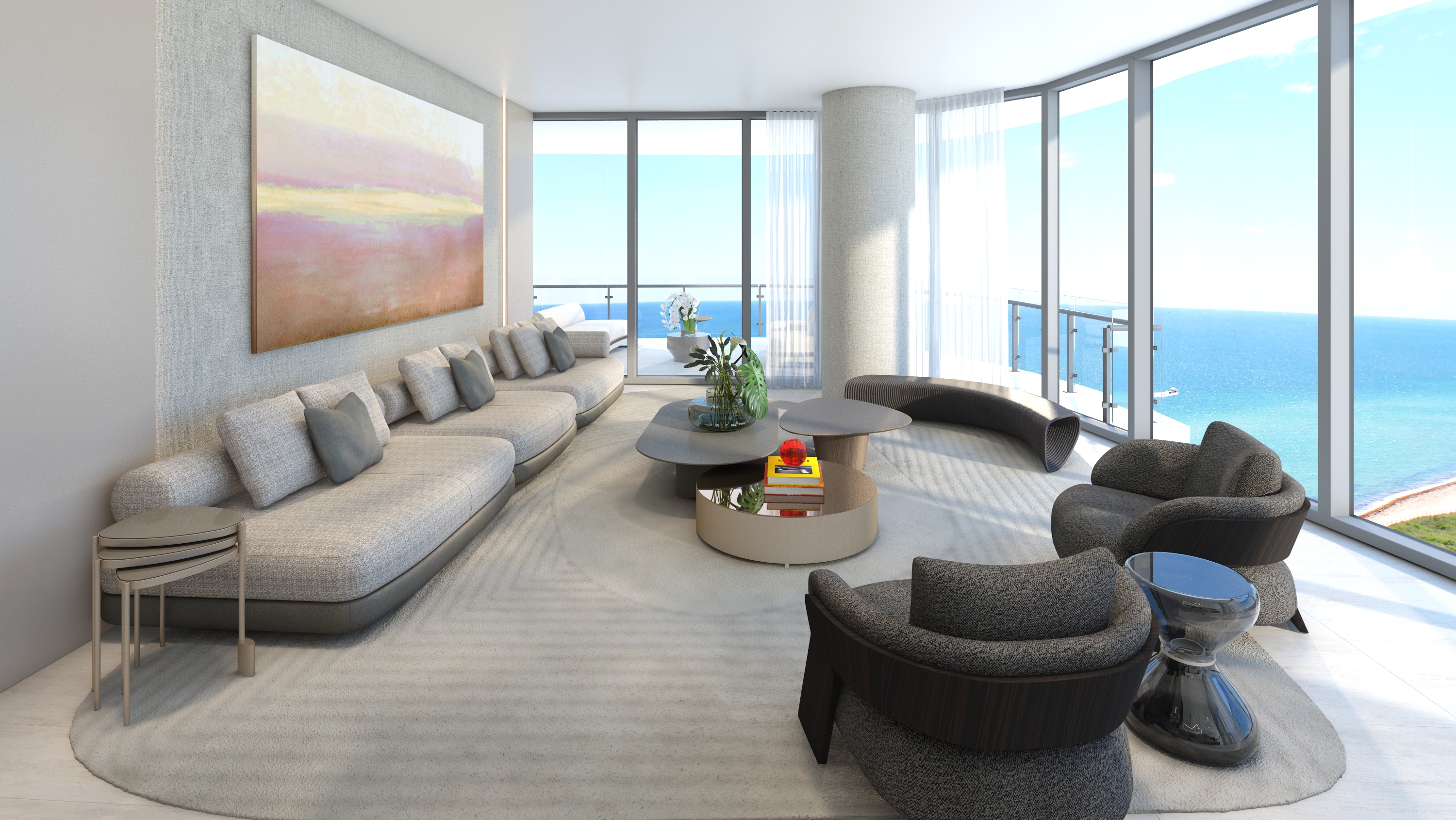 no modificar nada de los muebles en la imagen crear mas nitidez efectos de luz y sombras en la vista de la parte exterior crear mas realismo del mar cielo y efectos de sol