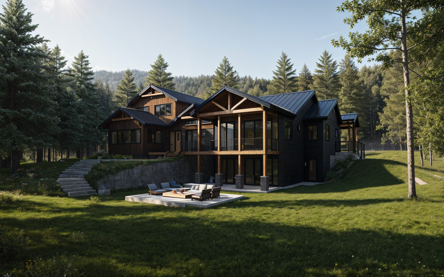 make an ultra realistic 4k render place the house in a forest in mont tremblant set the season to summer at midday use the current trendy cladding include a family sitting around the fire don t change the shape and the materials
