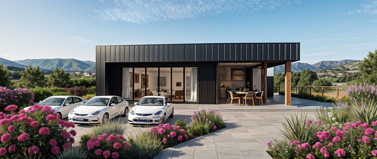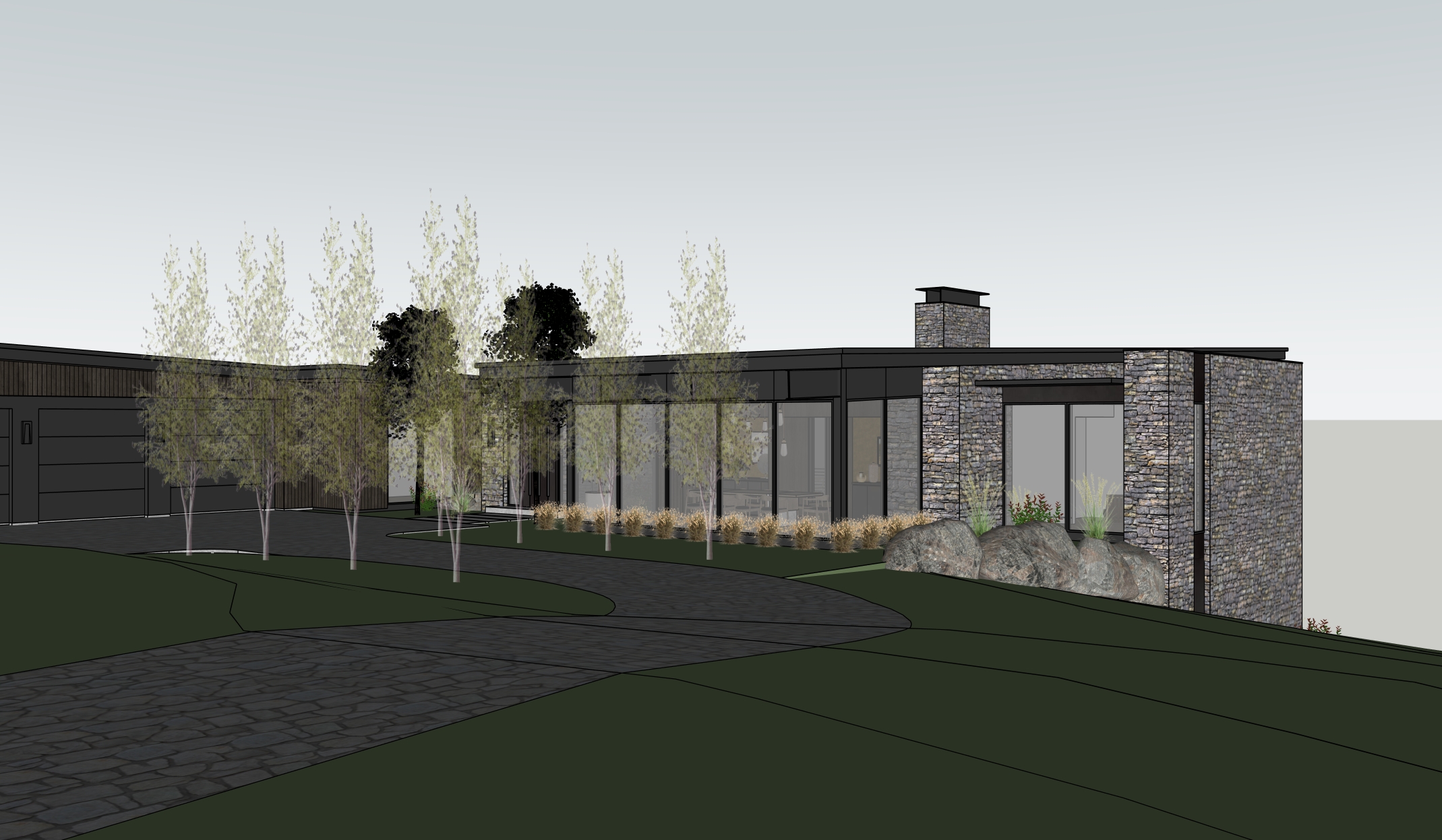 home located in the blue ridge mountains near asheville north carolina rough hewn tennessee fieldstone and stained vertical shiplap siding dark metal accents and window frames plate steel chimney coping to match window frame color flagstone driveway home located in north carolina hardwood forest with dense trees beside home and behind grasses and sparse native plants in foreground no lawn morning light with light fog in trees behind