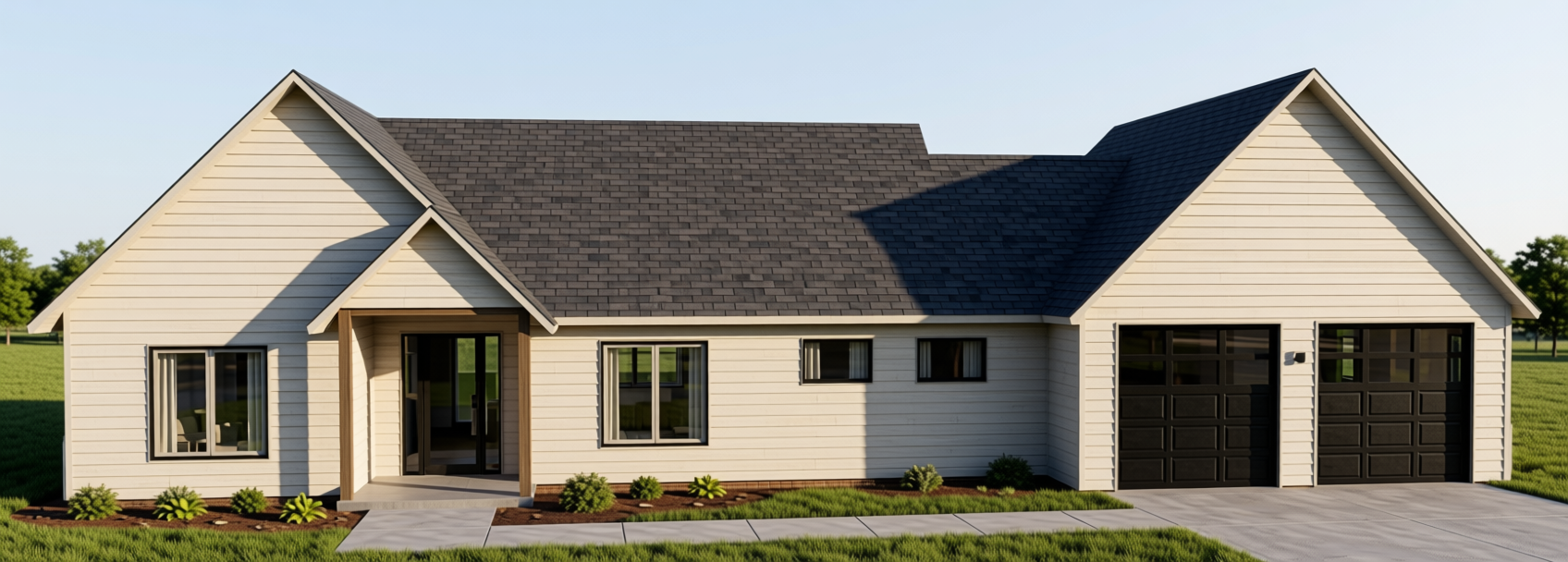 maintain architectural details make it more realistic locate it in an open field with forest in the back forty