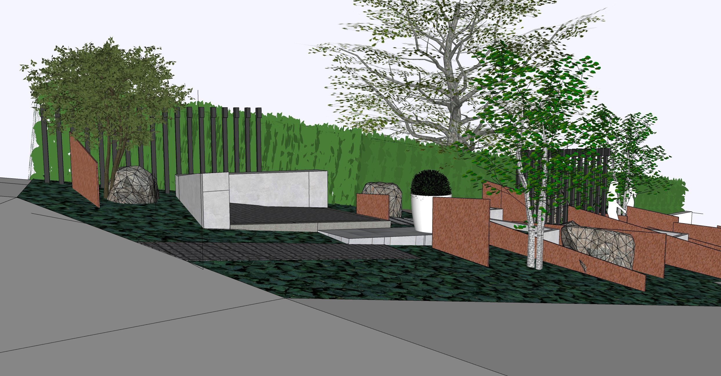 site running downhill concrete wall rustic corten steel sheets prairie style planting with grasses granite sett patio realistic hedge and trees steel posts set behind wall in front of hedge sun coming from top left