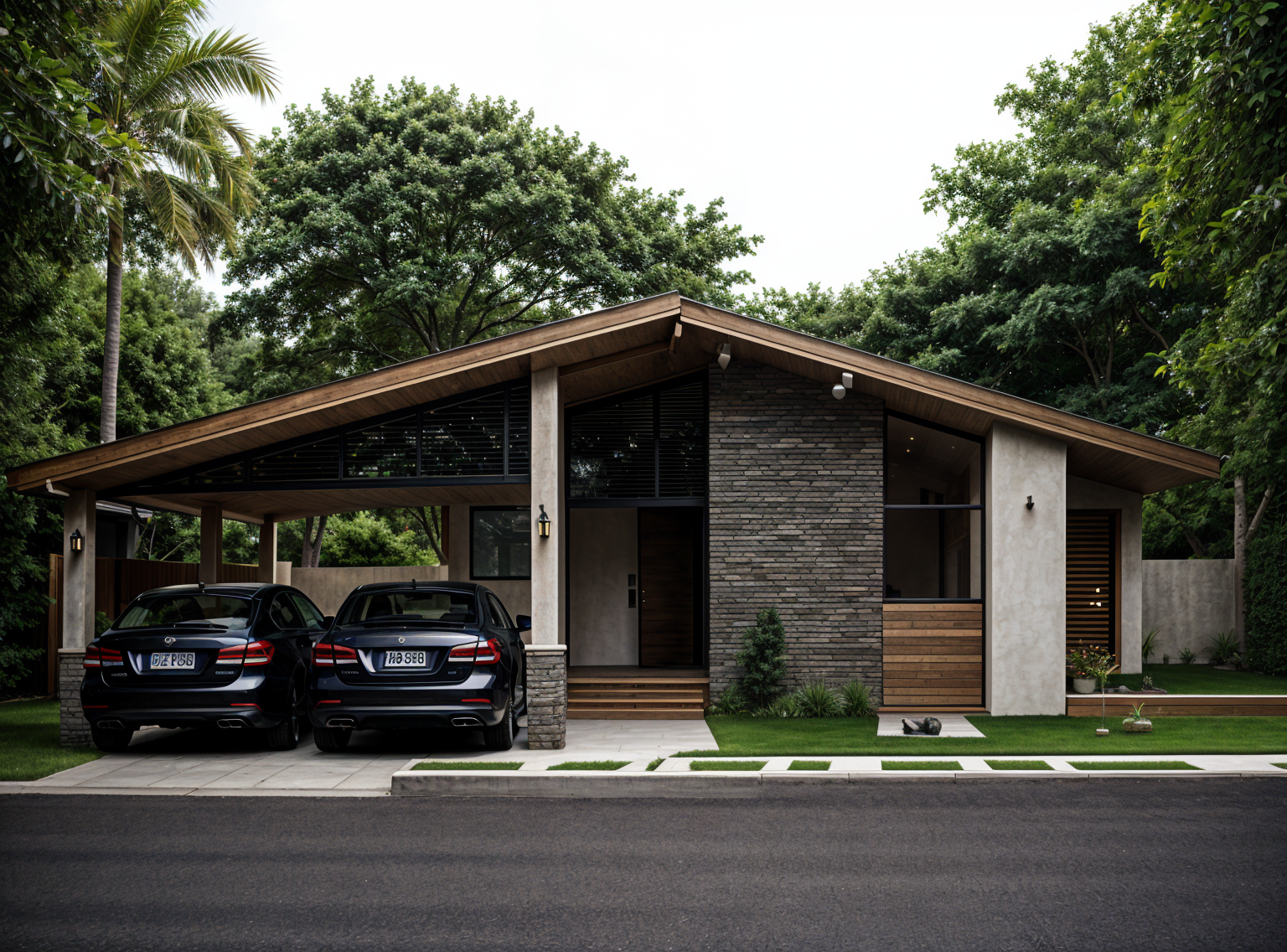 create a night scene of this modern tropical house with a two car carport keep the same materials stone cladding wood panel accents white walls and metal roof with wooden eaves illuminate the exterior using warm ambient lighting soft recessed lights under the carport ceiling and roof eaves wall sconces near the main door and columns subtle garden uplights highlighting plants and the stone fa ade show soft interior glow through the windows for a lived in look render with a realistic night sky gentle reflections on the cars and pavement and soft shadows for a calm elegant atmosphere ensure photorealistic lighting balance between warm highlights and cool ambient tones