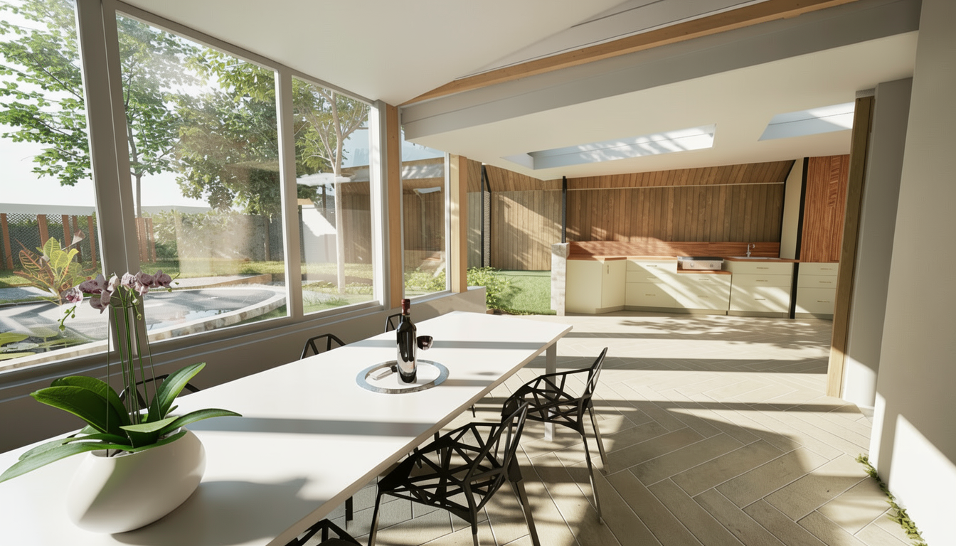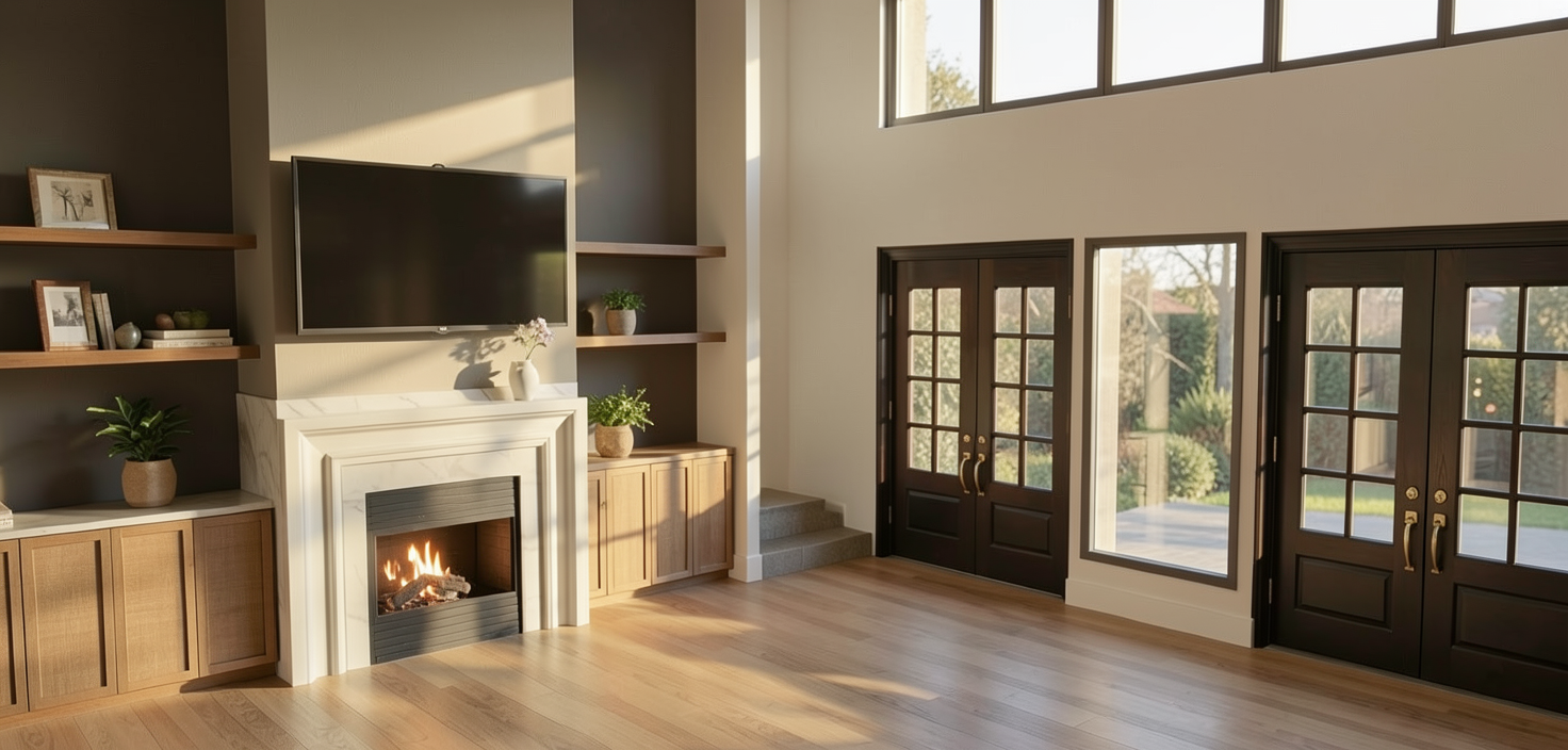 master bath with plaster walls stone inside shower vertical stone tile on right side of image lighter white oak wood flooring is a matte stone tan and shower has stone mosaic floor