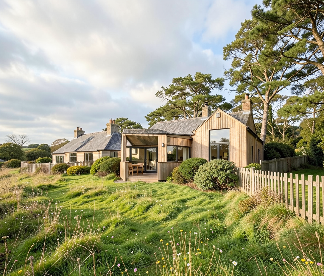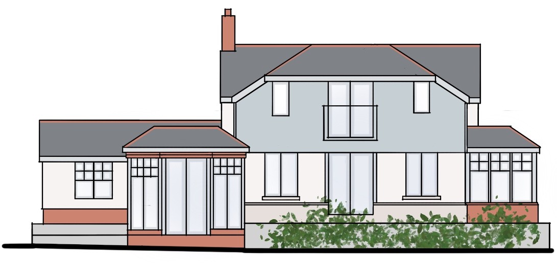 externally at ground floor brick and stone plinths render and stone at first floor either render or light blue weatherboarding soft grey plain casement windows glass balcony slate roof tiles oak detailing to the orangery all grass to the front with a 1m stone wall drop 1m in front of the house add trees behind