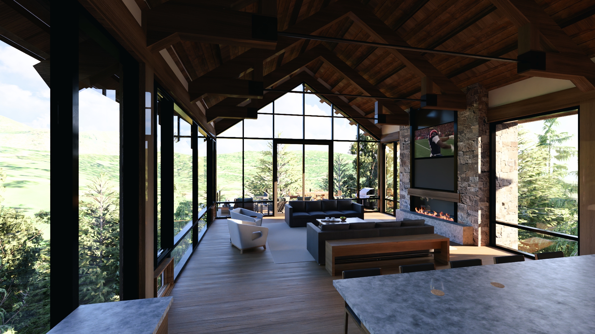 interior render a photorealistic 3d perspective of this house reference the current material style just enhance them rough sawn timber truss perlins t g ceiling stone walls keep model geometry the same windows doors roof walls make a lodgepole pine forest wintertime outside do not change the view only enhance the current materials and realistic montana vegetation background detailed textures in the wood siding and glass reflections and a vibrant clear sky with light atmospheric depth render in hyper realistic architectural visualization quality 8k resolution windows dont see through the home metal roof light wood siding